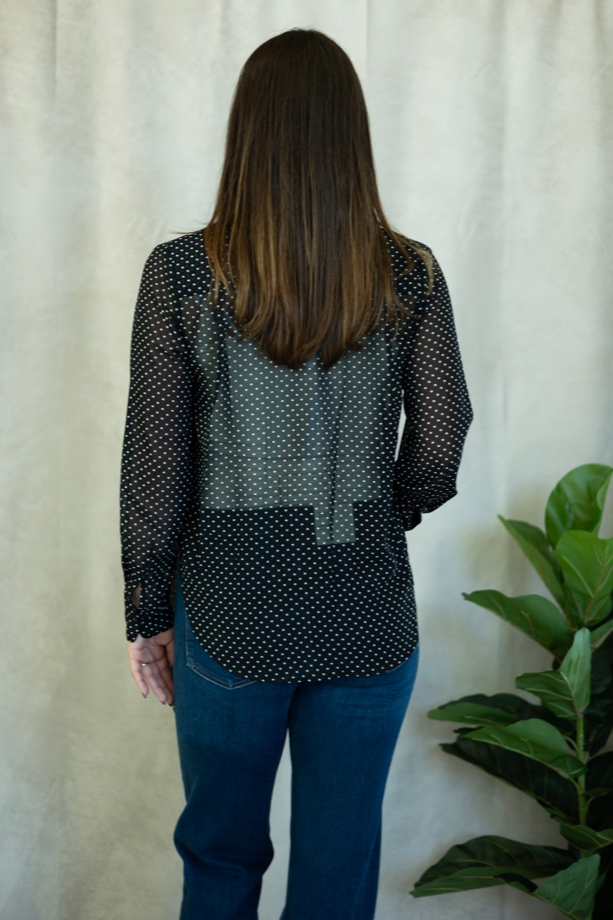 This black mesh long-sleeve top features a subtle neck tie, combining sheer elegance with refined detailing. Its lightweight construction makes it perfect for layering or wearing alone for a sophisticated touch. Pair it seamlessly with a Niki Biki.