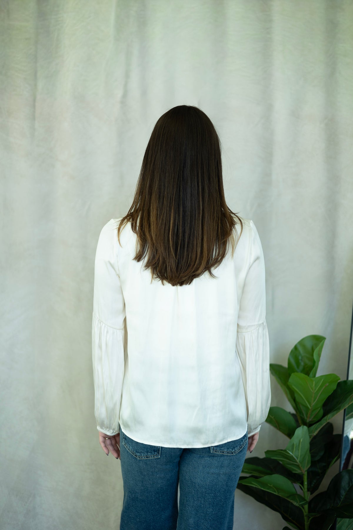 This champagne-colored blouse features a long sleeve design paired with an elegant, long neck tie for a sophisticated look. Crafted from lightweight fabric, it offers comfort and breathability, making it an ideal choice for layering or wearing on its own throughout the day. Its refined silhouette enhances versatility, suitable for both professional settings and stylish casual wear.