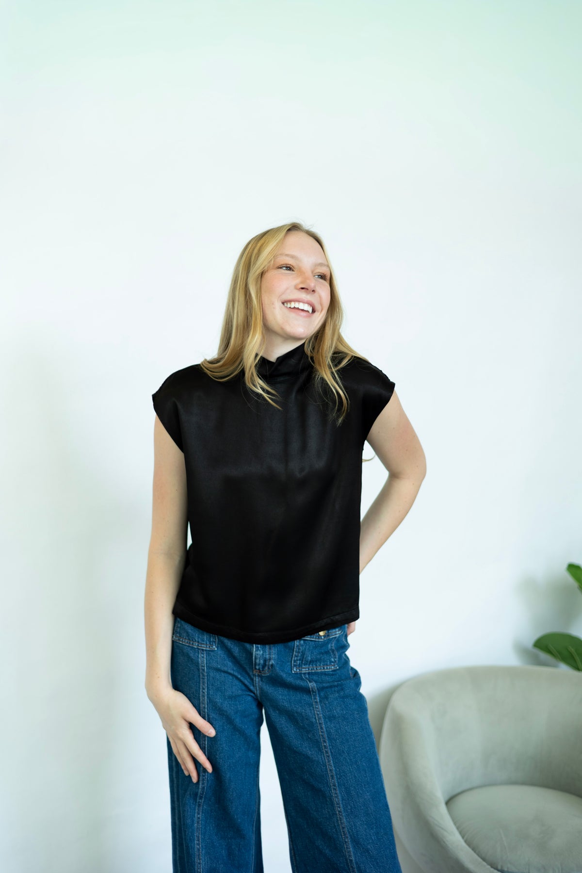 Experience refined elegance with Bobi's Mock Neck Muscle Tee. Crafted with a satin-like texture, this tee offers a smooth, luxurious feel that elevates your evening wardrobe. Its sleek design and subtle sheen make it an ideal choice for a sophisticated night out, effortlessly combining comfort and style.