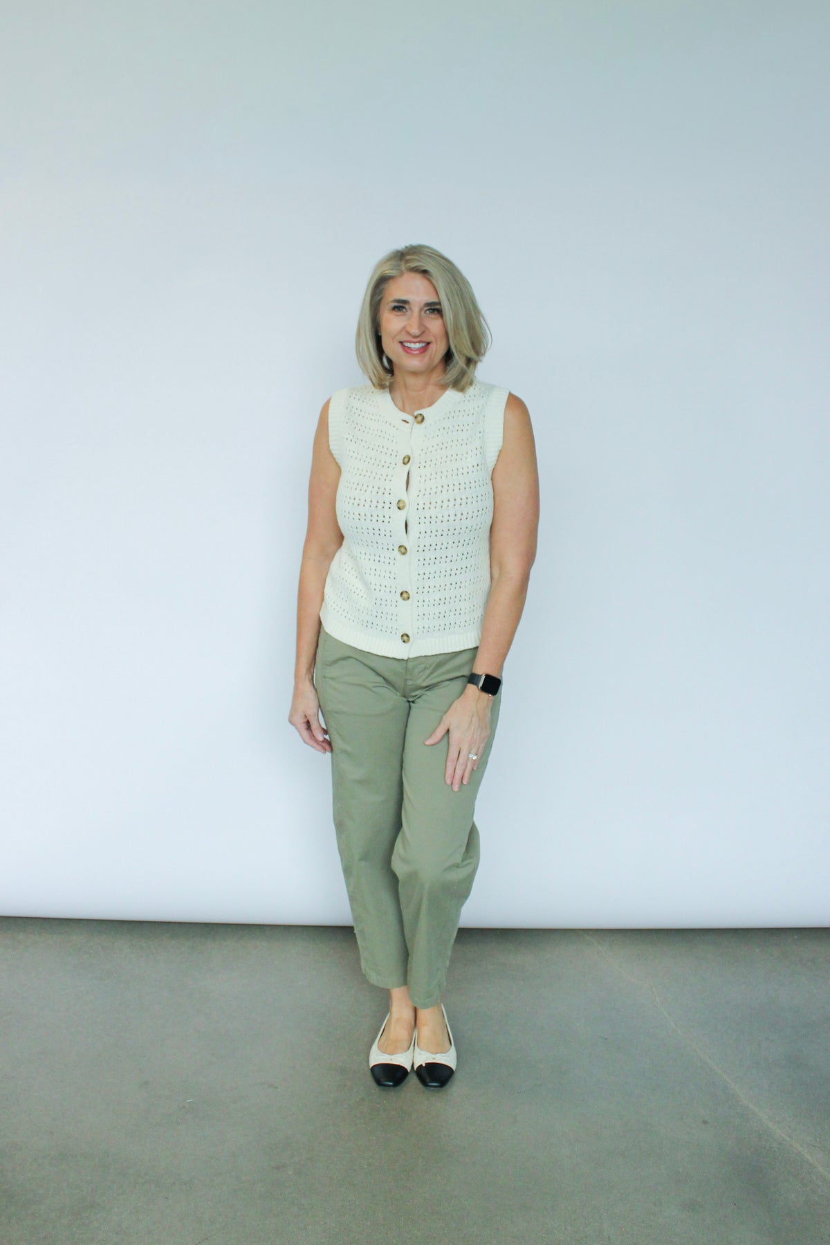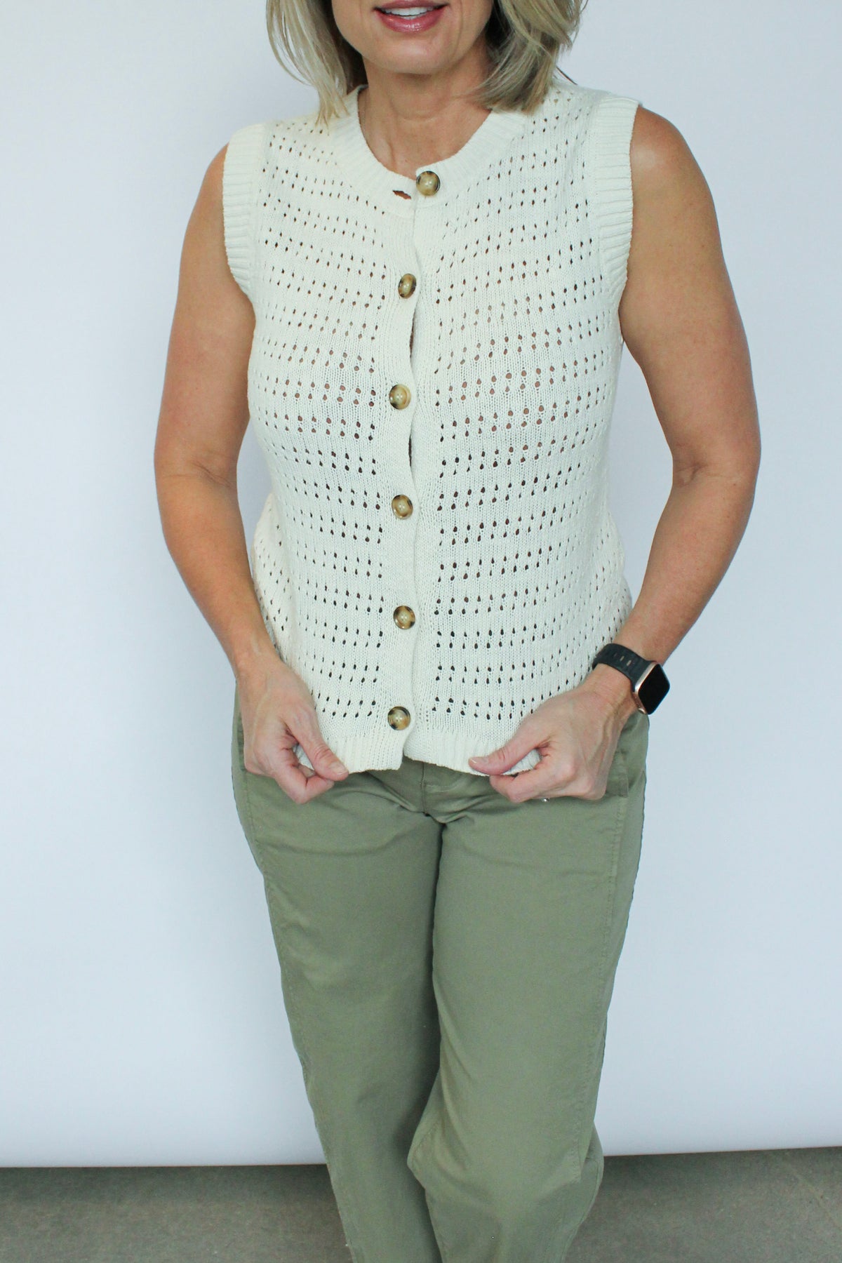 This pointelle shell from Sanctuary combines refined craftsmanship with effortless comfort. The delicate pointelle knit offers subtle texture and breathability, while the relaxed fit provides ease of movement. The button-front closure delivers styling versatility—layer it over basics or wear it as a standalone piece.
