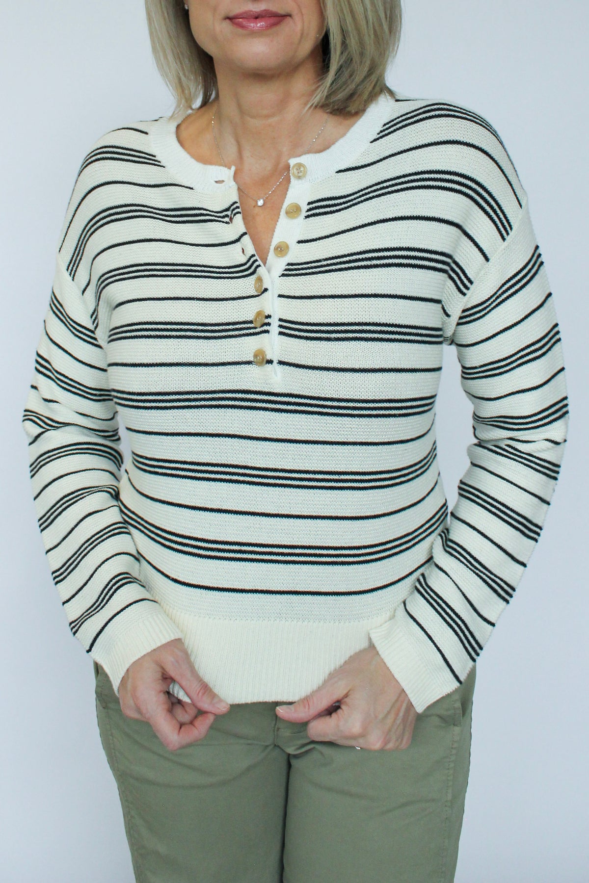 Crafted from quality knit fabric, this Sanctuary henley sweater combines timeless appeal with modern versatility. The black striped pattern provides subtle visual depth, while the half-button placket allows you to adjust coverage and layering options throughout the day. Long sleeves offer warmth without bulk, making this piece ideal for transitional seasons or layering year-round. A refined essential that works as hard as you do.