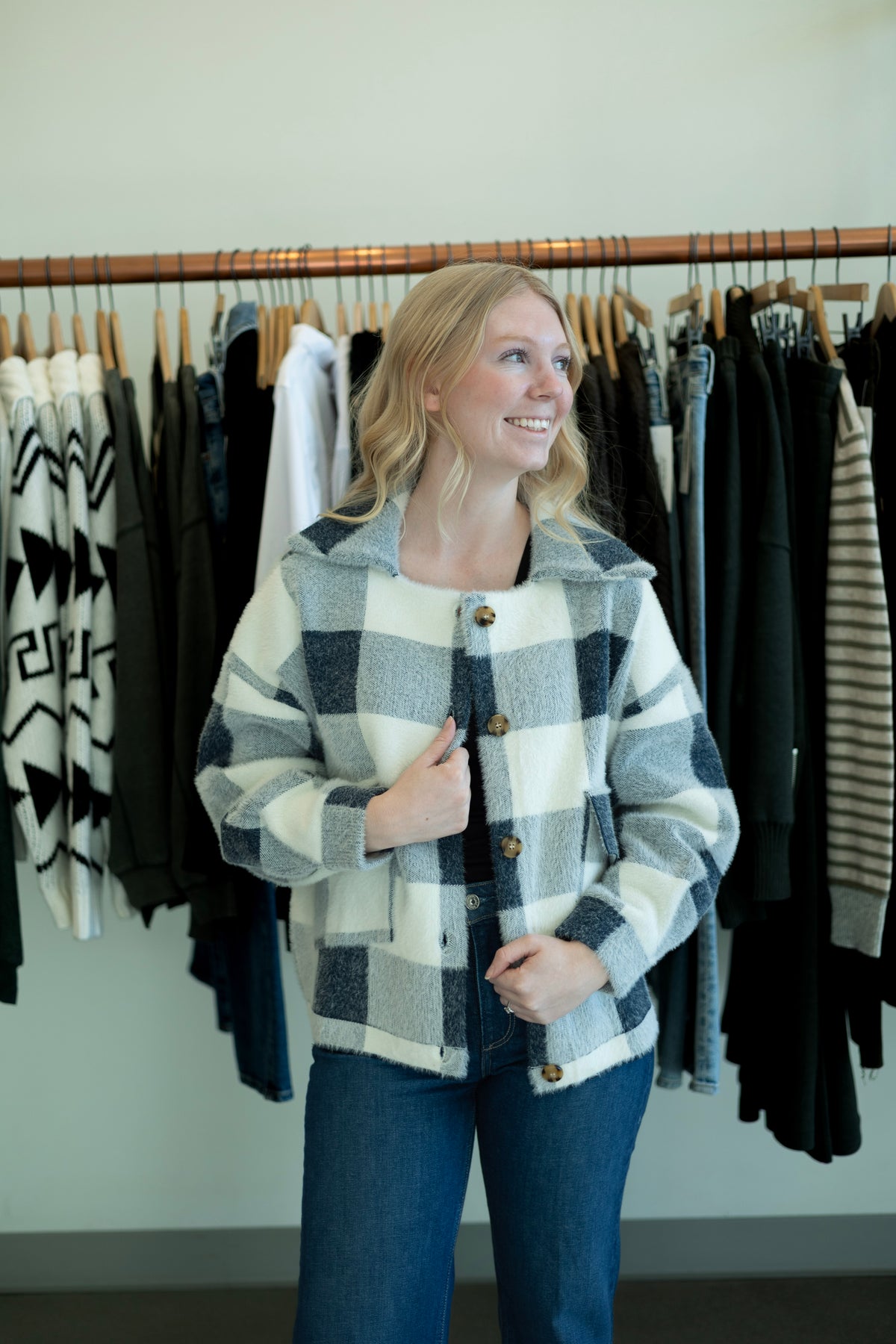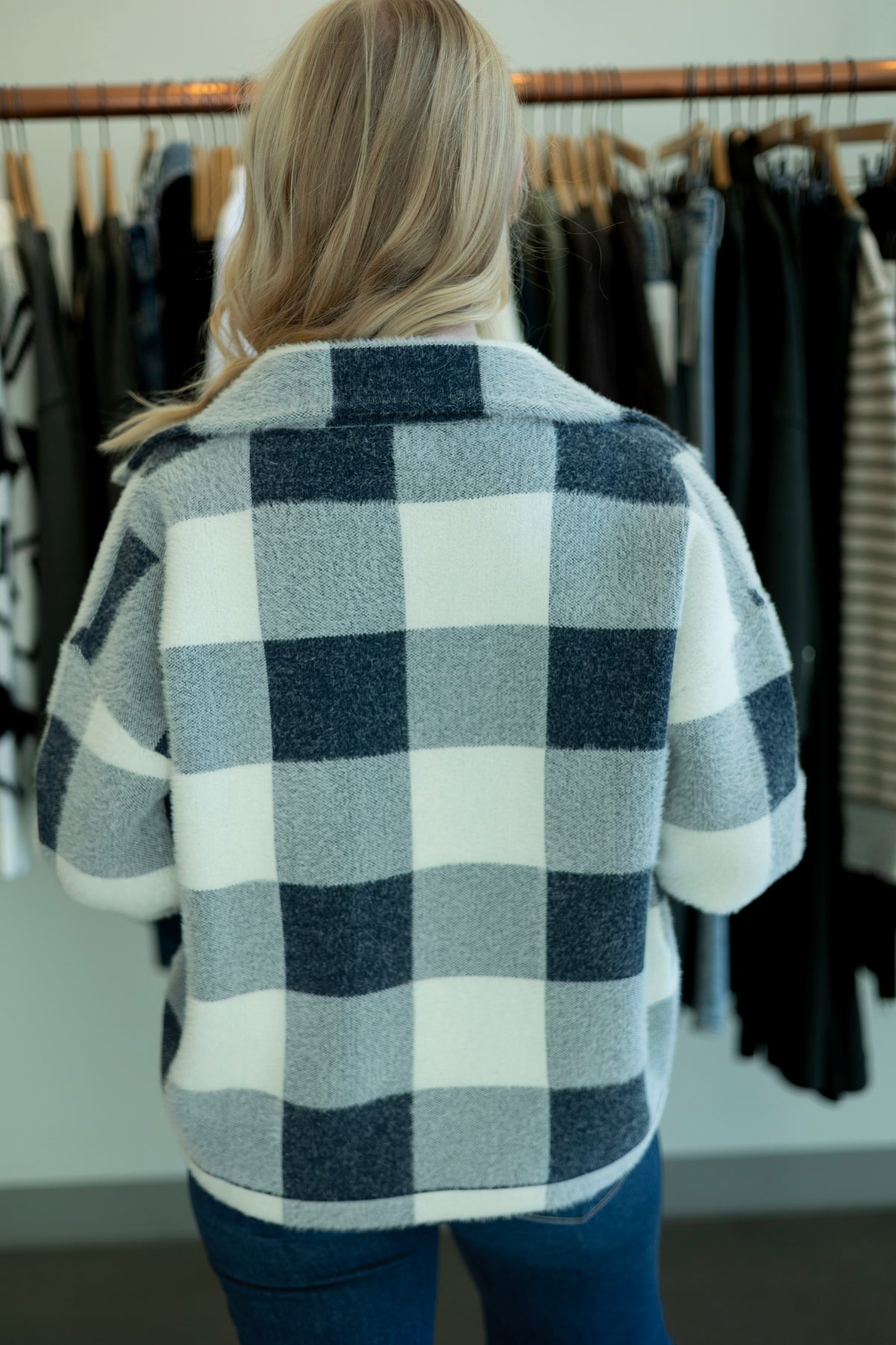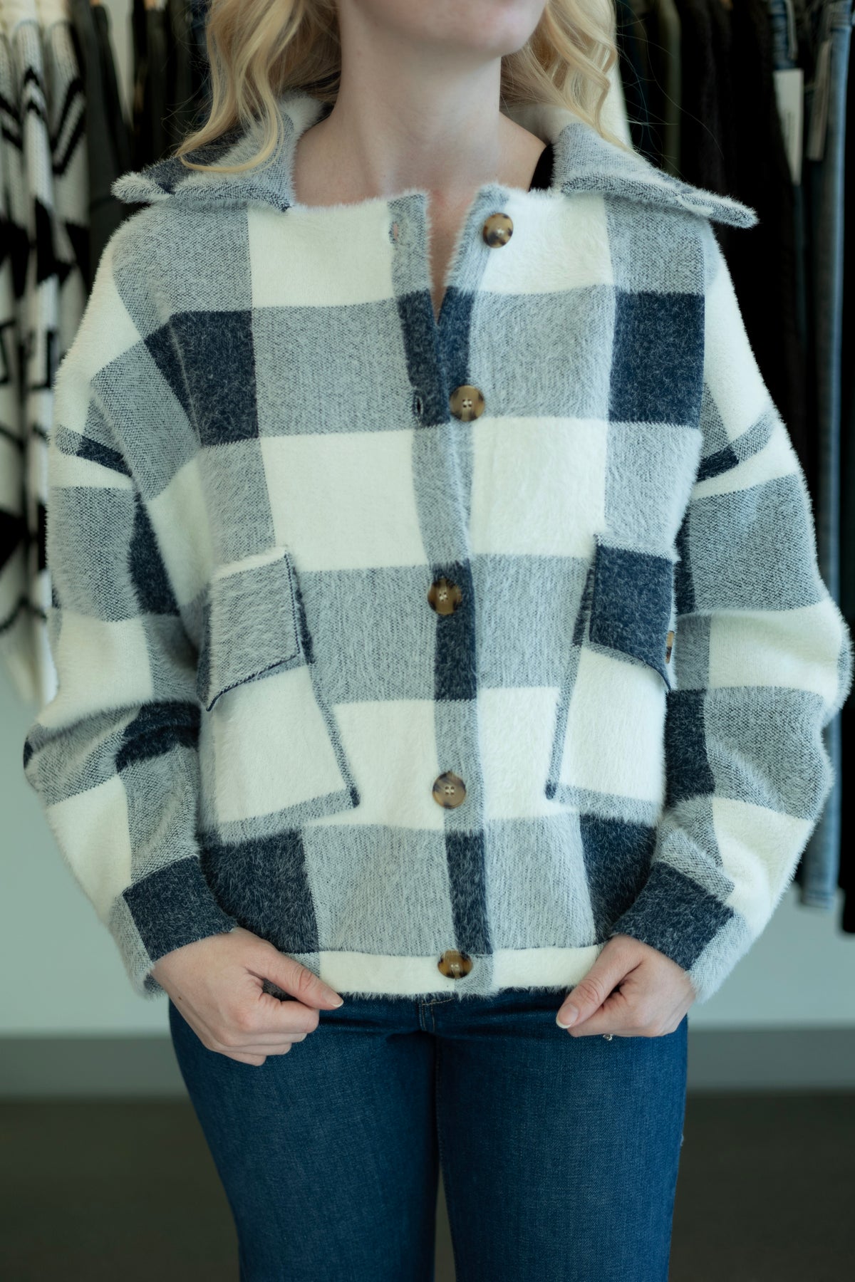 The Lola Buffalo Plaid Sweater Jacket is your new go-to layering essential! This adorable navy blue and white plaid button-down brings effortless charm to any outfit. Perfect for throwing over your favorite tee or pairing with a crisp white shirt, it's the versatile piece that makes getting dressed fun. Whether you're heading to brunch or a casual weekend adventure, this cute sweater jacket adds that perfect pop of pattern and personality to your wardrobe.