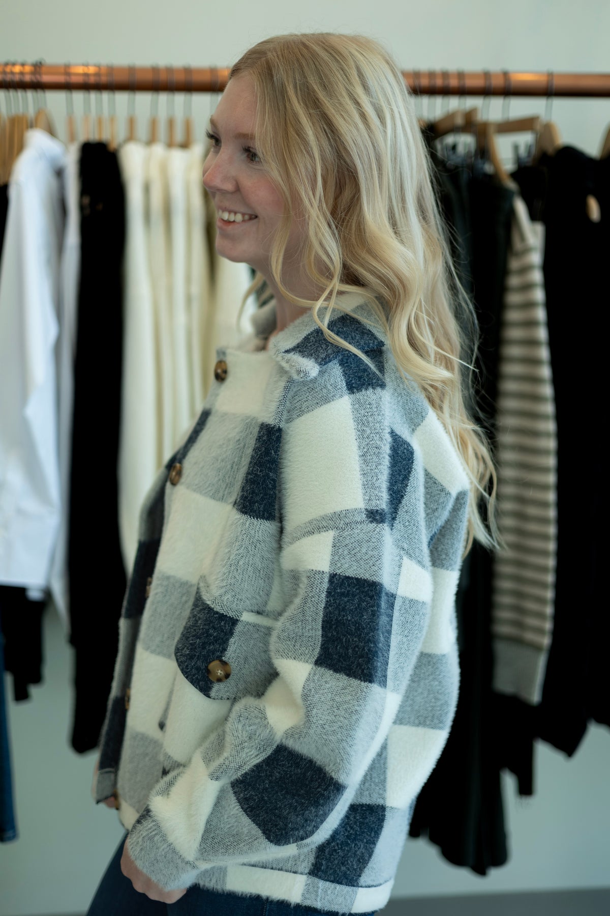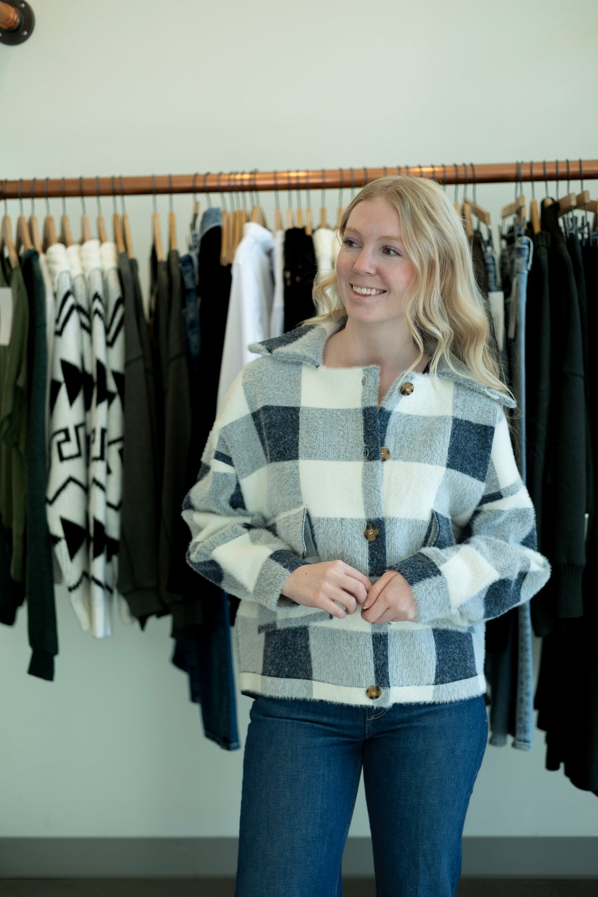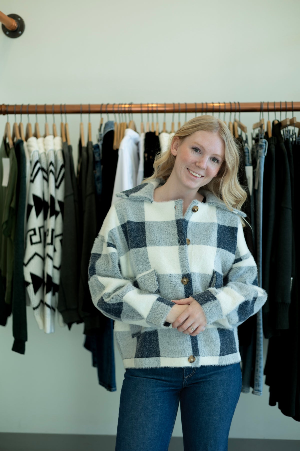The Lola Buffalo Plaid Sweater Jacket is your new go-to layering essential! This adorable navy blue and white plaid button-down brings effortless charm to any outfit. Perfect for throwing over your favorite tee or pairing with a crisp white shirt, it's the versatile piece that makes getting dressed fun. Whether you're heading to brunch or a casual weekend adventure, this cute sweater jacket adds that perfect pop of pattern and personality to your wardrobe.
