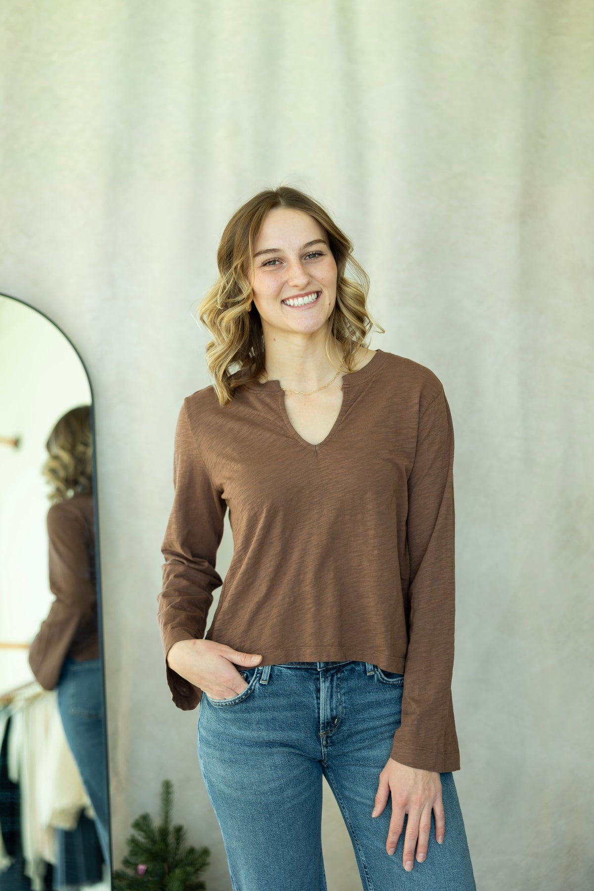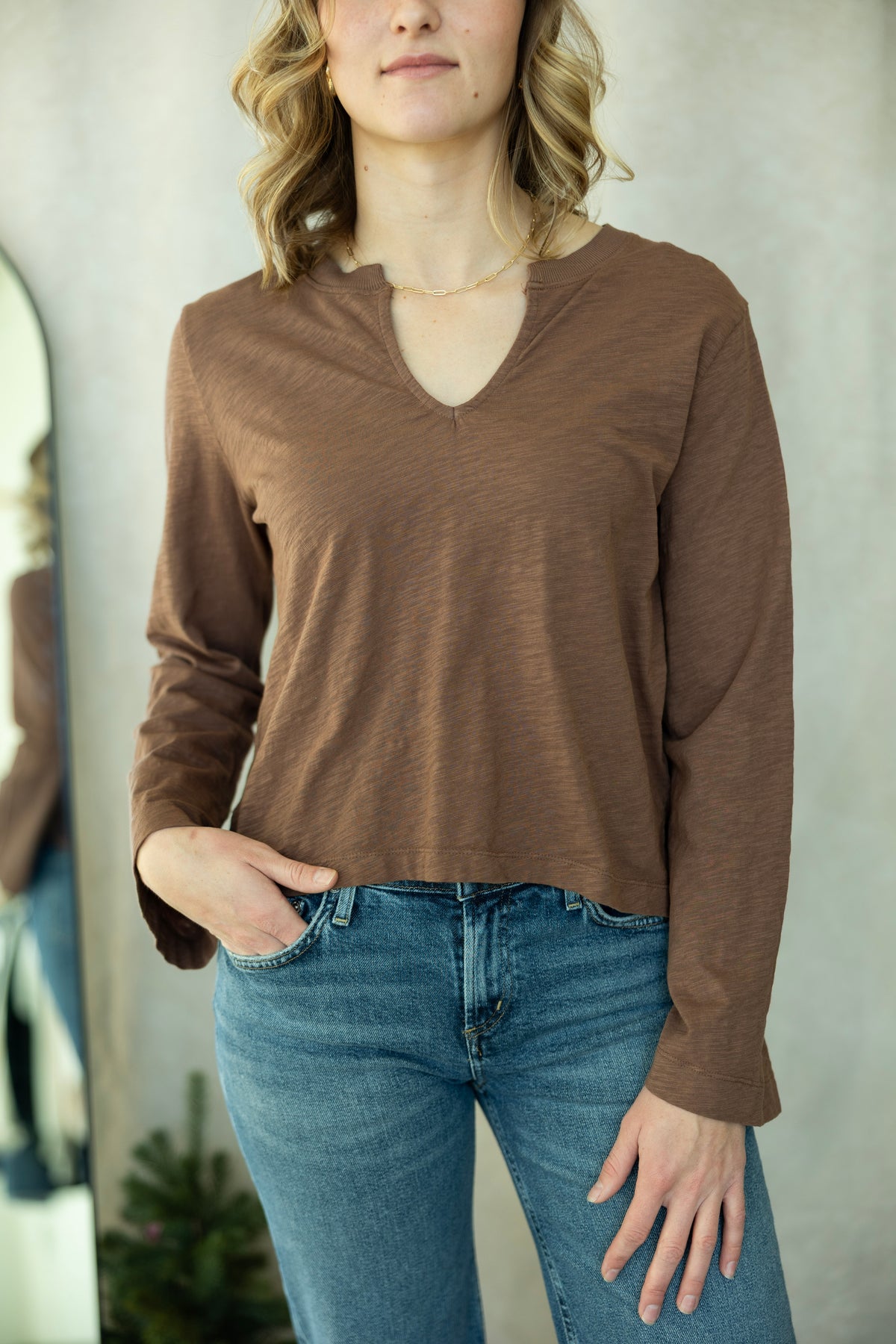 Effortlessly cool meets cozy comfort with this brown long-sleeve tee from Bobi. The split neck design adds just the right amount of edge, while the ribbed mix fabric keeps things interesting. Perfect for those days when you want to look put-together without trying too hard. Bell sleeves give it a relaxed, casual vibe that works with everything in your closet. Layer it, style it solo—either way, you've got an instant wardrobe favorite.