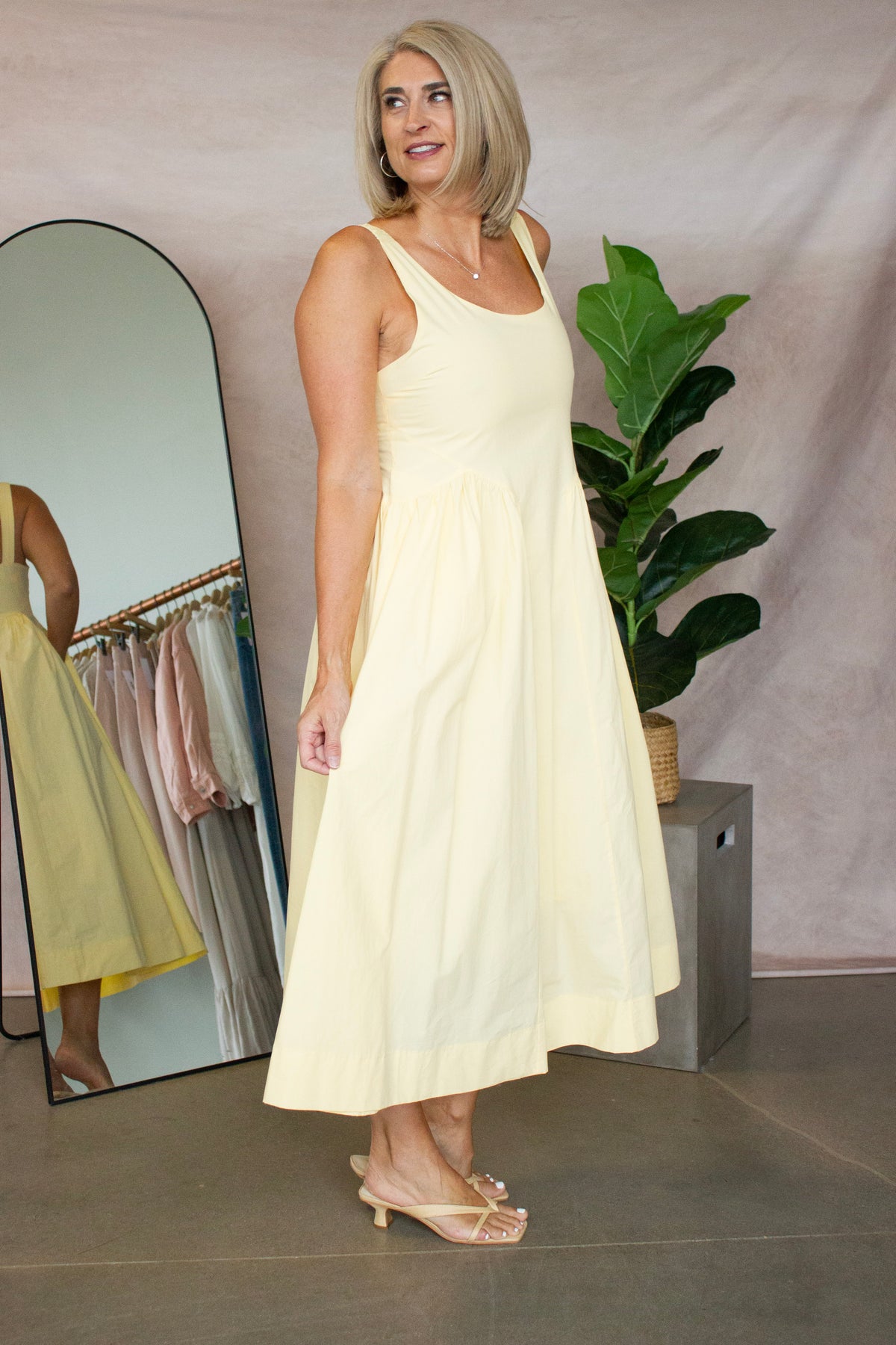 This sleeveless A-line midi dress combines timeless style with everyday wearability. Crafted from crisp poplin fabric in a cheerful yellow hue, it features a flattering silhouette that skims the body without clinging. The sleeveless design keeps you cool and versatile, perfect for layering with cardigans or jackets. Ideal for casual outings, weekend brunches, or dressed up for special occasions. A timeless piece that transitions seamlessly from season to season.