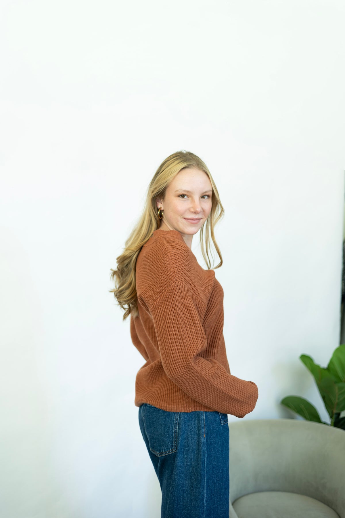 The Cornelia Sweater in a beautiful orange hue combines warmth with effortless style. Featuring a wide neckline, it offers a relaxed fit that enhances comfort and makes layering easy. This lightweight sweater is perfect for transitional weather, providing a breathable yet cozy option to elevate your wardrobe with expert craftsmanship and modern design.