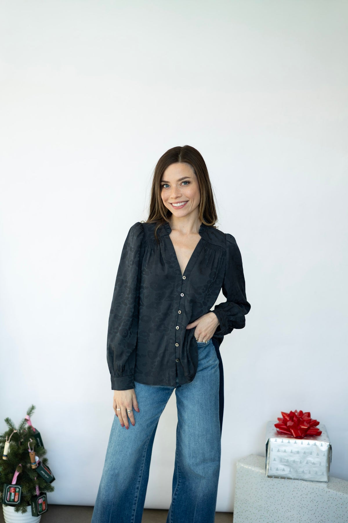 Elevate your wardrobe with our L/S Split Neck W/ Ruffled Neck shirt. This charcoal top features a subtle cheetah print design and button-down front for a sophisticated look. A playful twist on a classic piece.