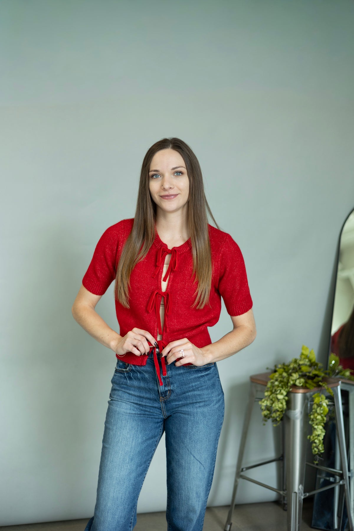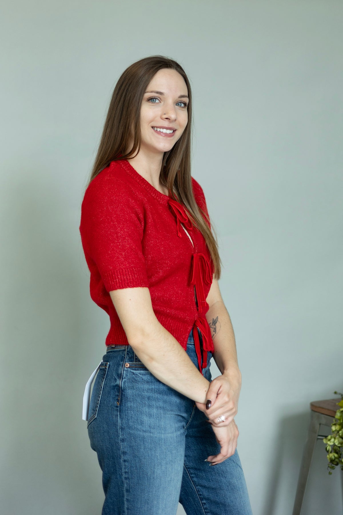 Elevate your wardrobe with the Sereia Cardigan, featuring a vibrant bright red hue and elegant velvet bows tied at the front. Designed by Steve Madden, this piece expertly combines bold color with delicate details, adding a sophisticated touch to your ensemble.