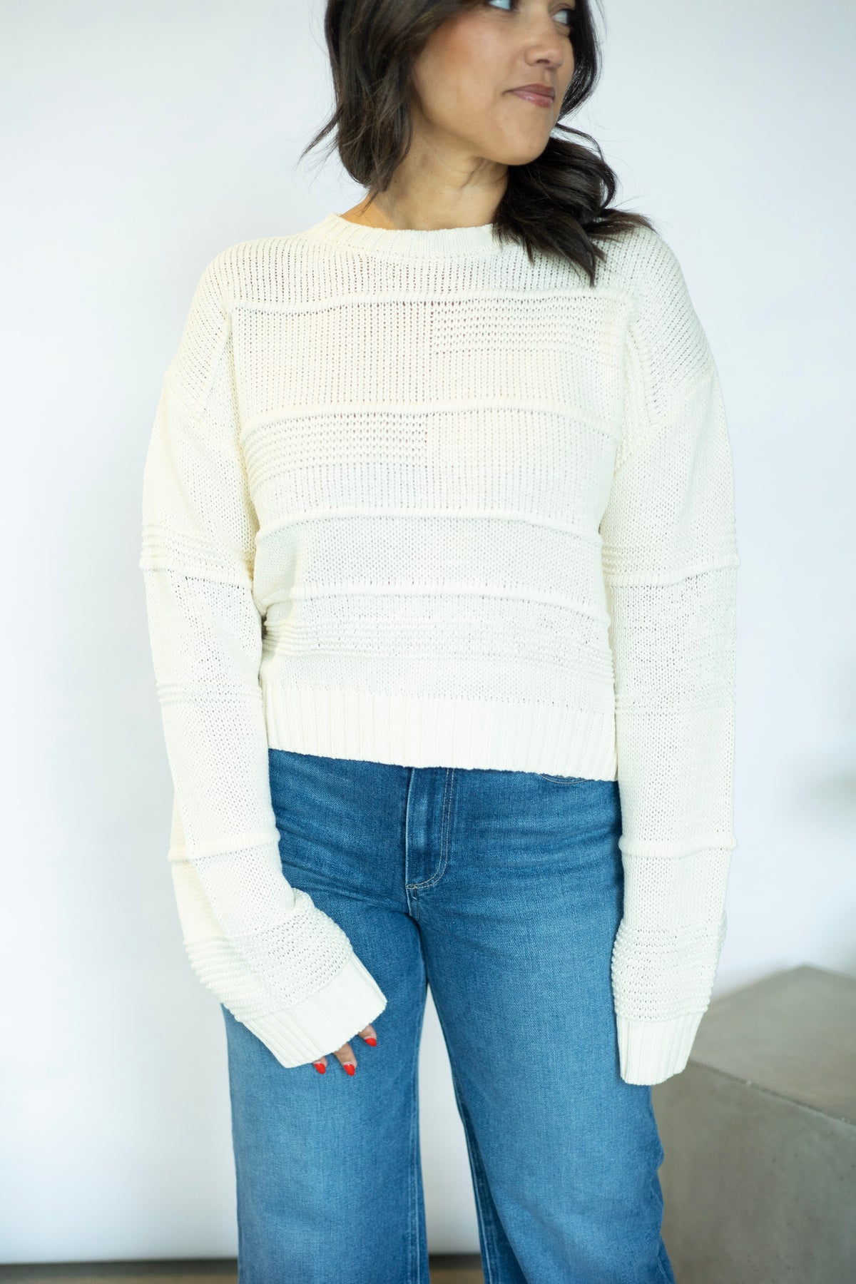 The Cassi Textured Shadow Stripe Sweater in cream is a lightweight, textured knit ideal for layering during fall. Its subtle shadow stripe design adds understated depth, making it an effortless go-to piece for transitional weather. Perfect for pairing with jeans or skirts, it offers both comfort and style for cooler days without bulk.