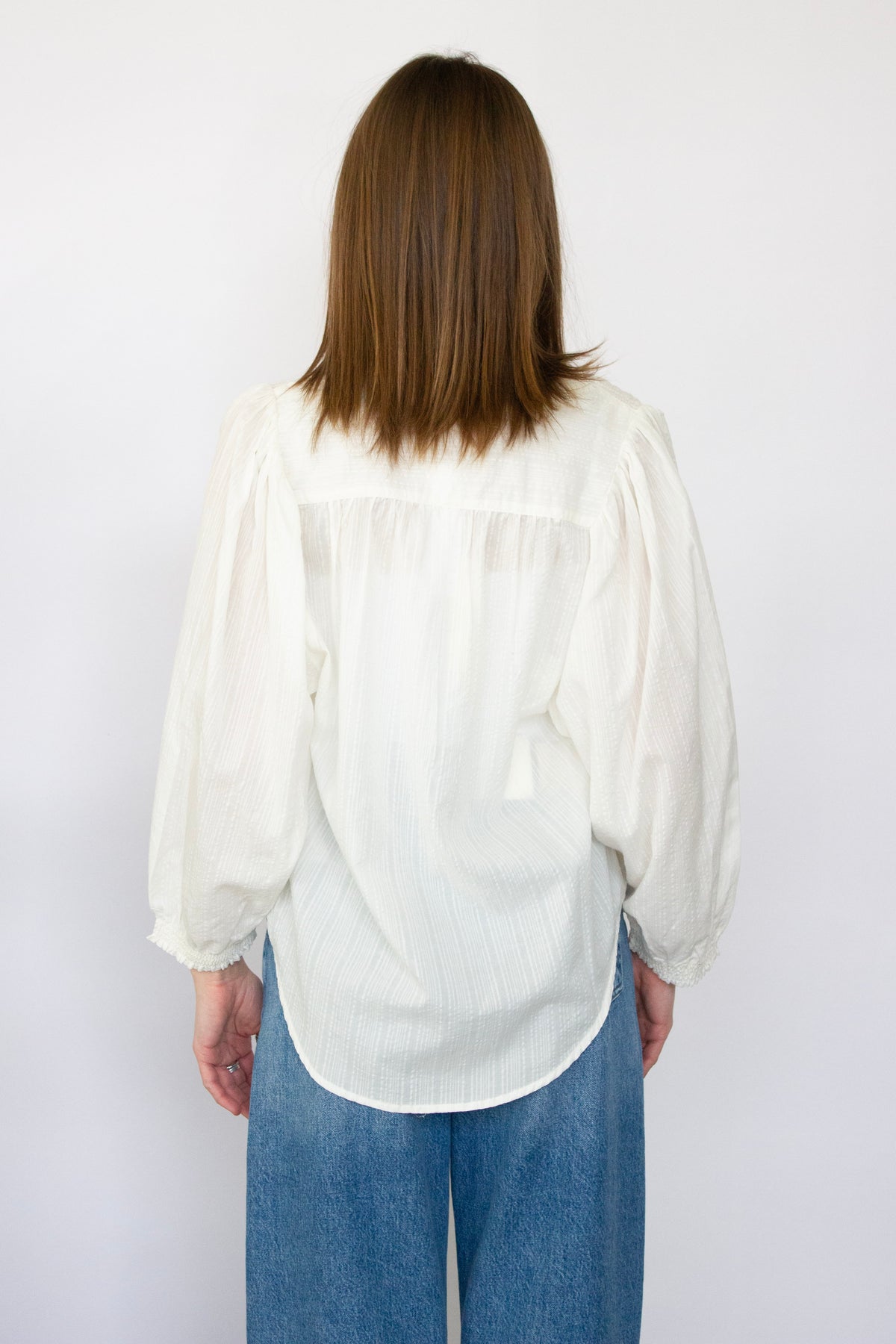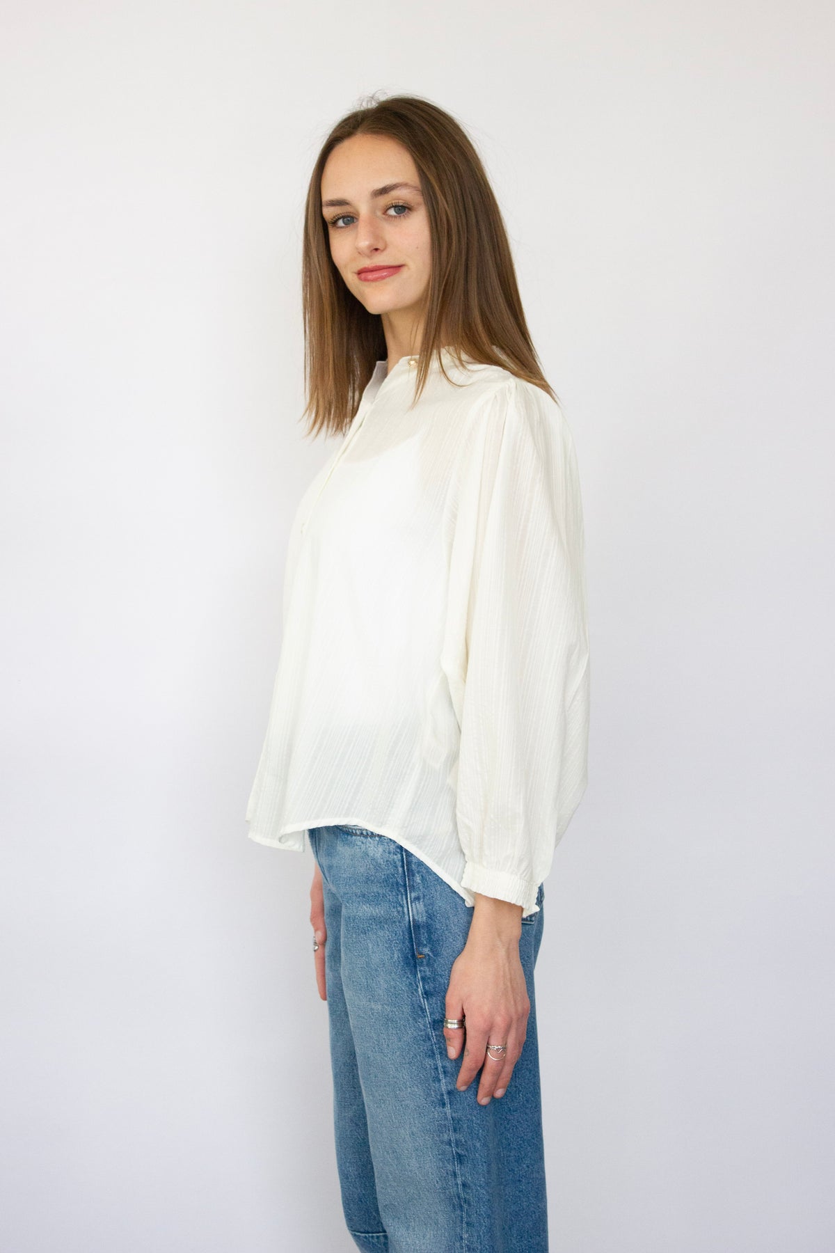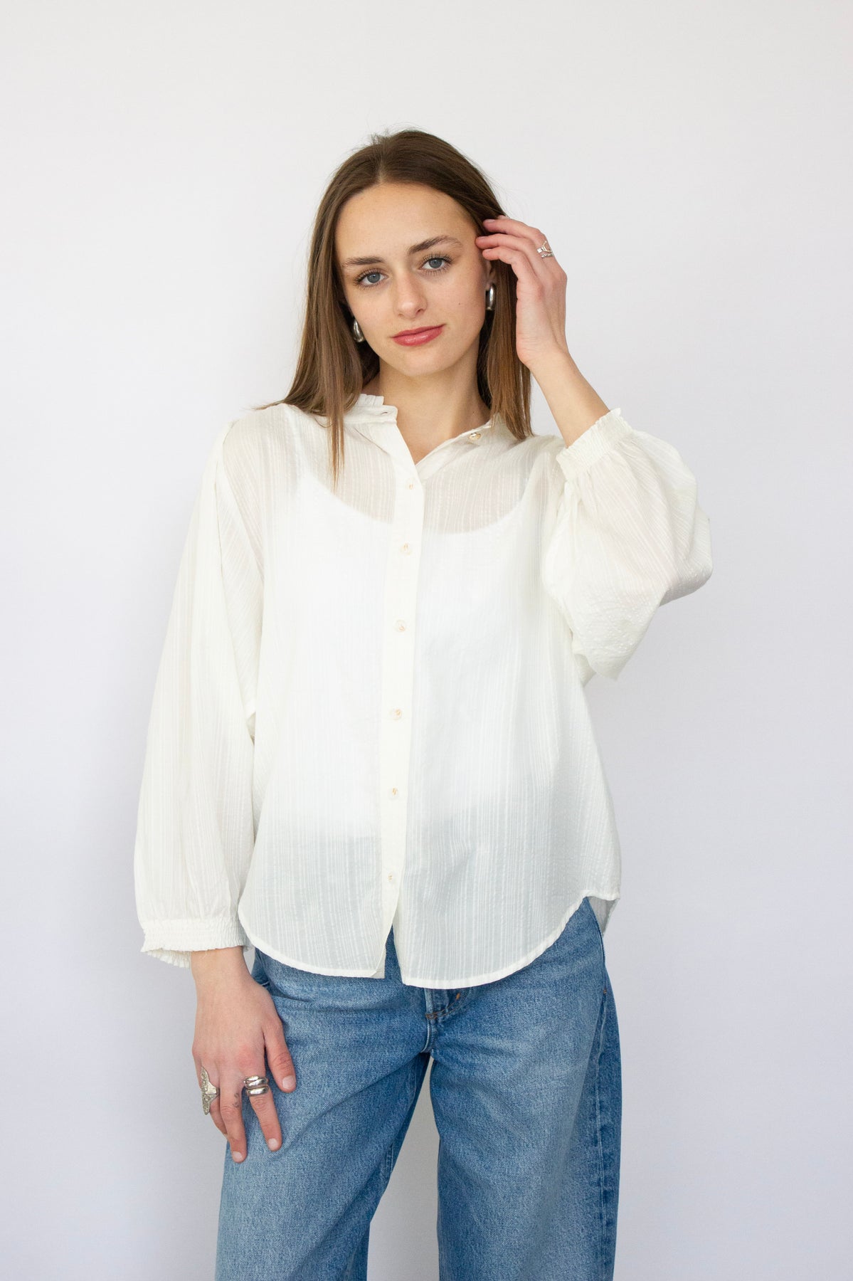 Elevate your everyday wardrobe with this charming 3/4 sleeve blouse. Featuring a classic button-down front and delicate ruffle detailing at the neckline and cuffs, this piece effortlessly transitions from office to weekend. The three-quarter sleeves offer a flattering silhouette while the refined ruffles add a touch of feminine sophistication. Perfect for layering or wearing solo, this versatile blouse pairs beautifully with jeans, skirts, or trousers for countless styling possibilities.