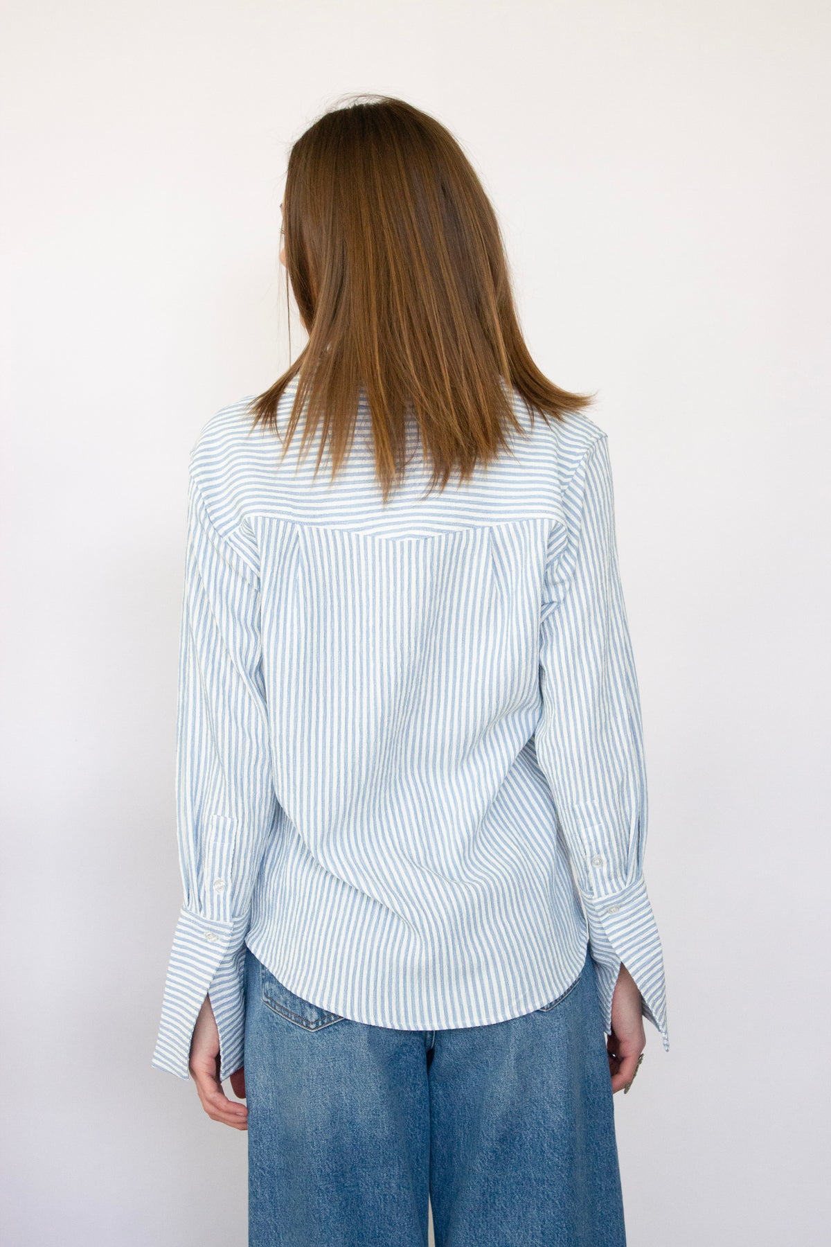 The Amaya Top features a classic blue and white striped pattern in a timeless button-down style. Perfect for layering or wearing solo, this versatile piece transitions seamlessly from casual weekends to polished workdays. The crisp stripes add visual interest while maintaining an effortlessly put-together look. A wardrobe essential that pairs well with jeans, skirts, or trousers.