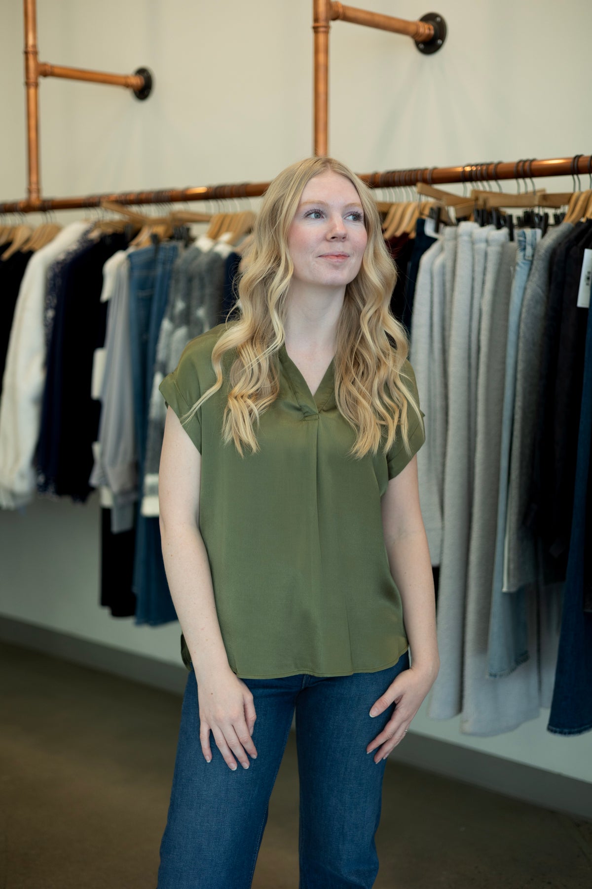 The Huxley Short Cuffed Sleeve brings effortless charm to your everyday rotation. This playful piece features a luxe satin texture that catches the light beautifully, paired with a flattering v-neck that works for virtually any occasion. The rich green hue is versatile enough to pair with neutrals or make a bold statement on its own. Those perfectly cuffed sleeves add a polished touch without taking itself too seriously. Slip it on and feel the difference quality fabric makes.