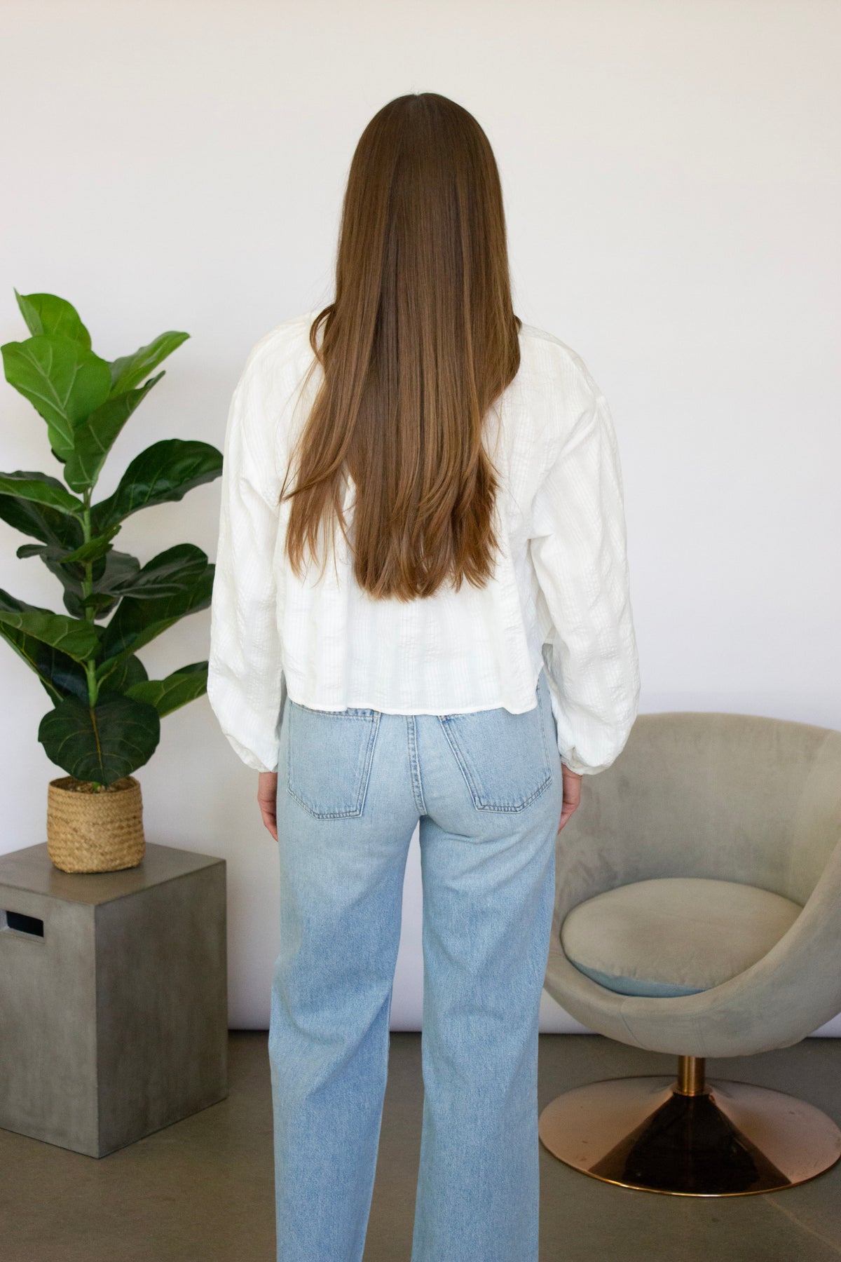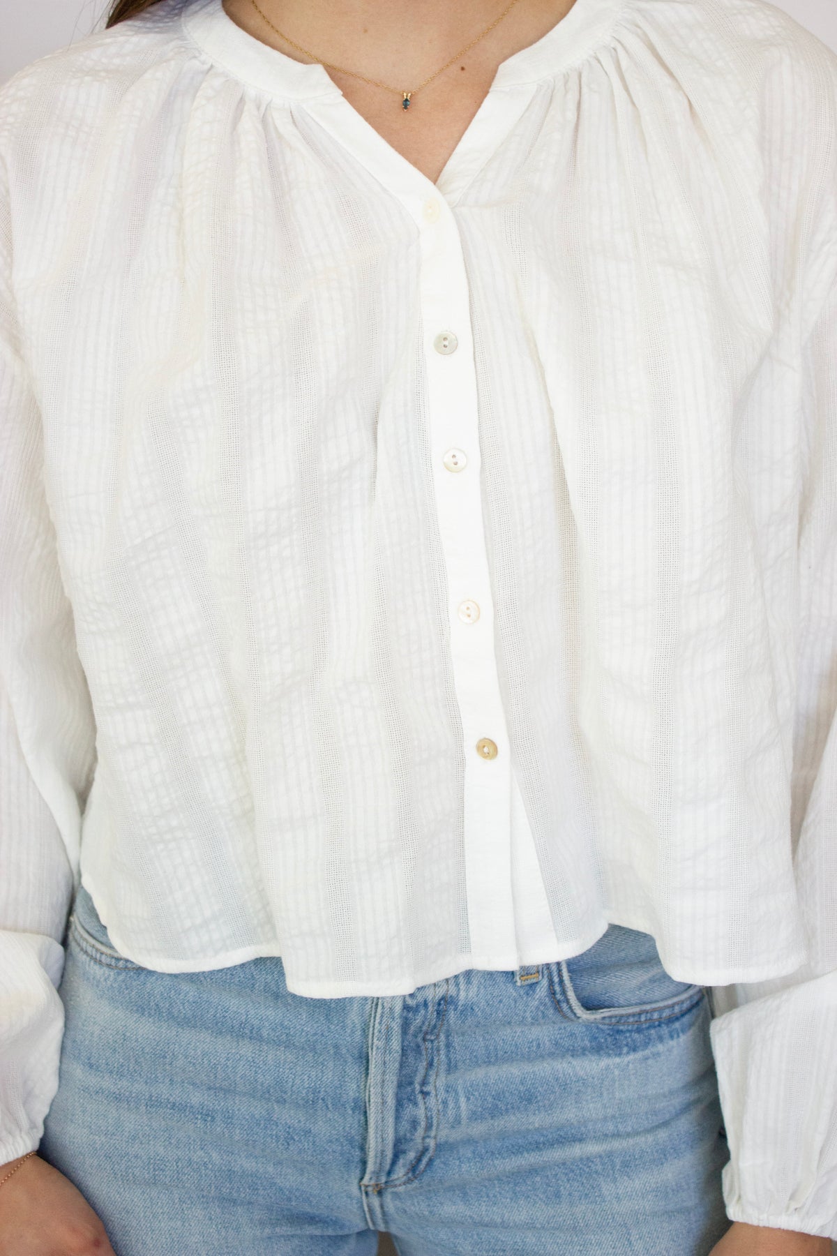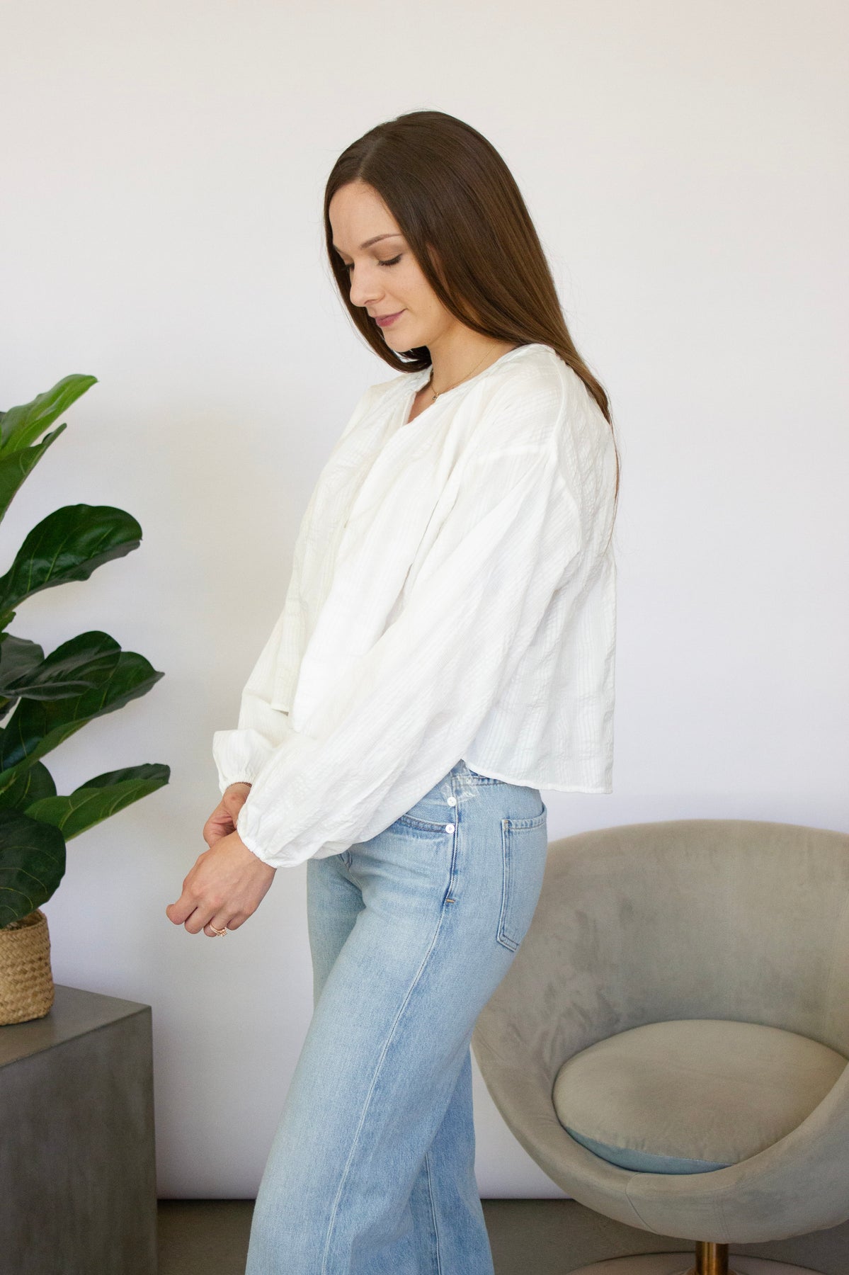 Effortless elegance meets textured sophistication in this crisp white cotton button-down blouse. Distinctive puckered detailing adds dimension and visual interest, creating a modern take on a timeless wardrobe essential. The structured cotton fabric drapes beautifully while maintaining its shape. A versatile piece that transitions seamlessly from office to weekend styling.