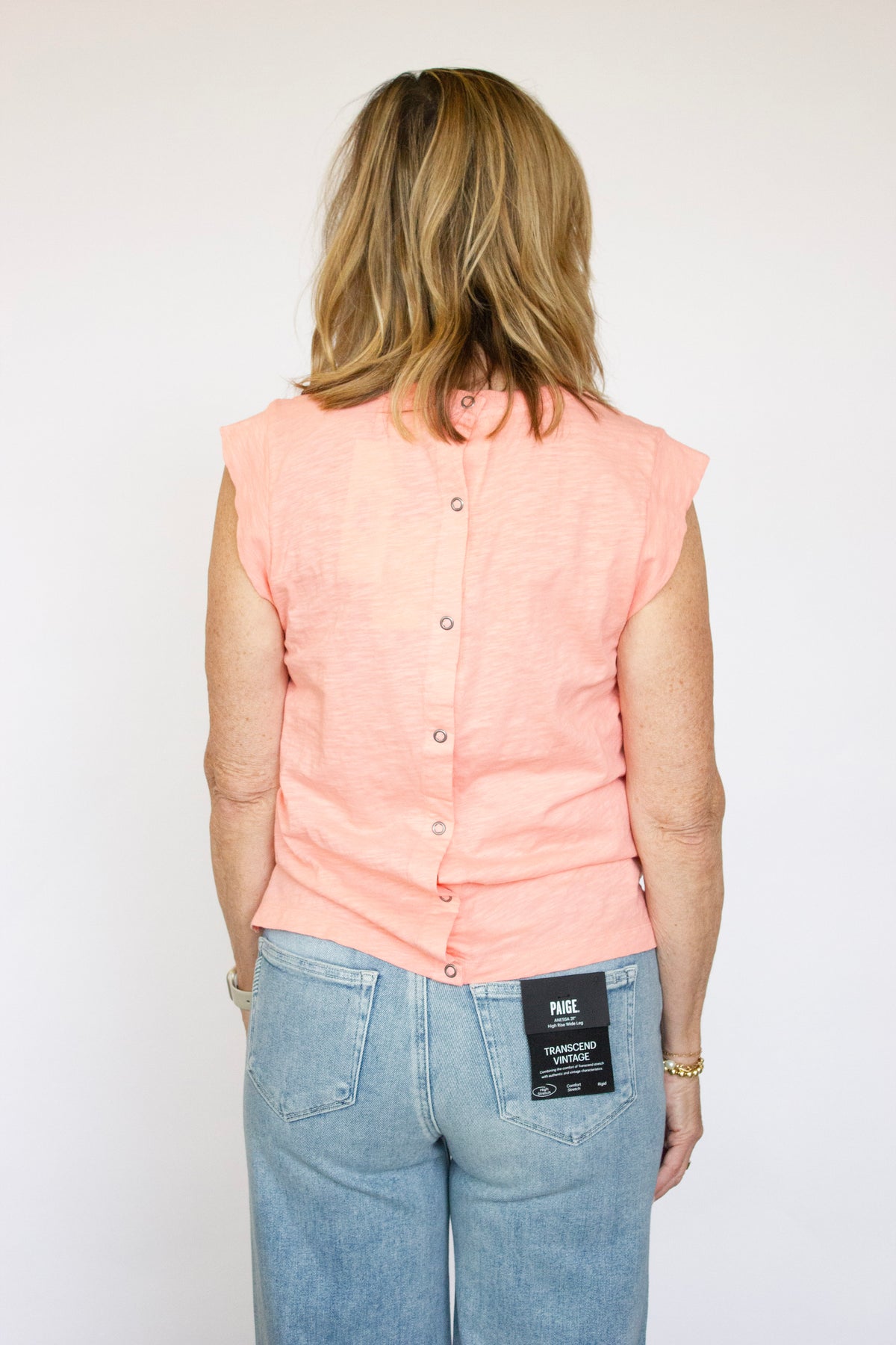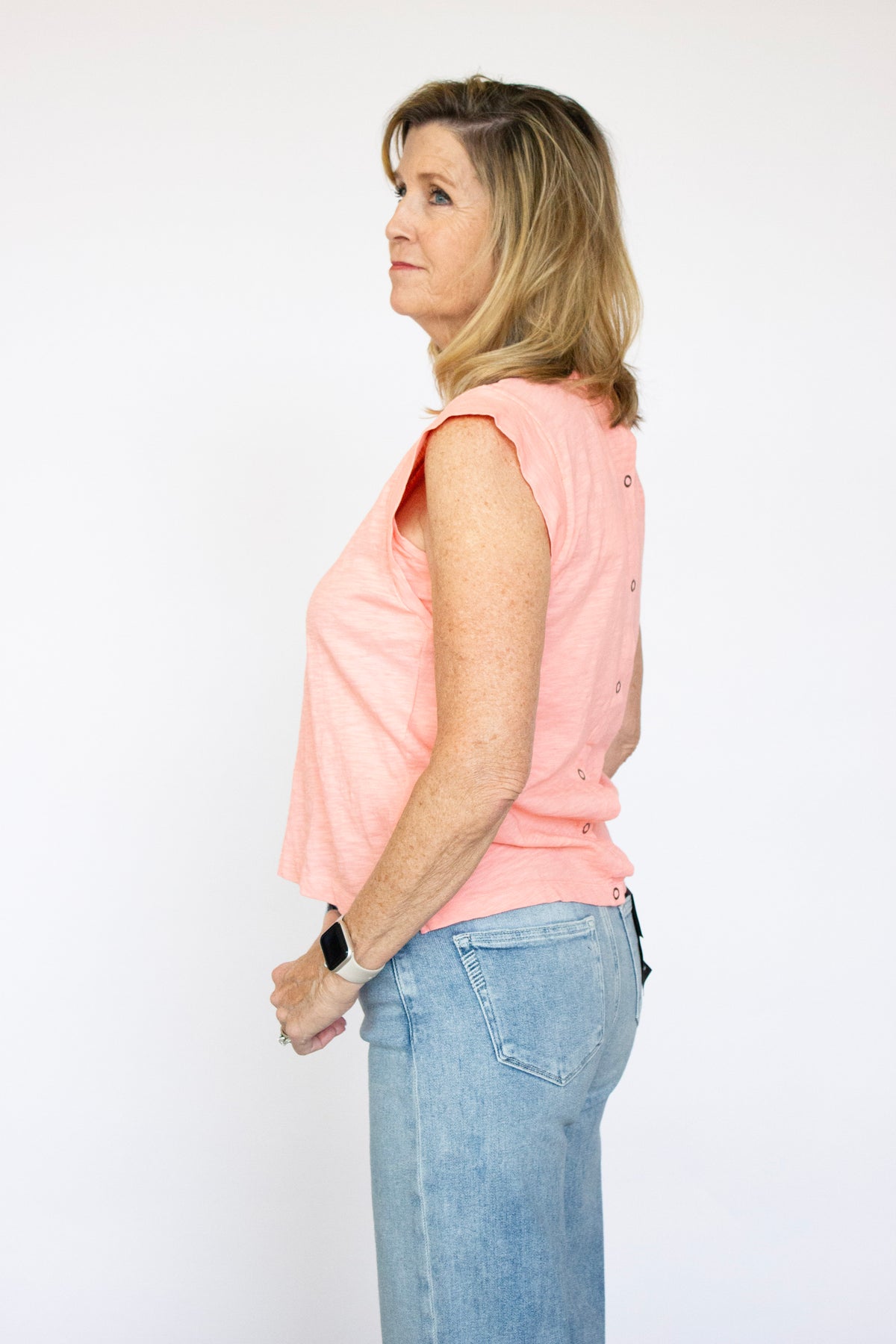Lightweight muscle tee with bold neon coloring and convenient snap closures running up the back. This piece combines comfort with an edgy, modern aesthetic. The breathable fabric keeps you cool while the back snaps add a unique functional detail that sets it apart from standard tees.
