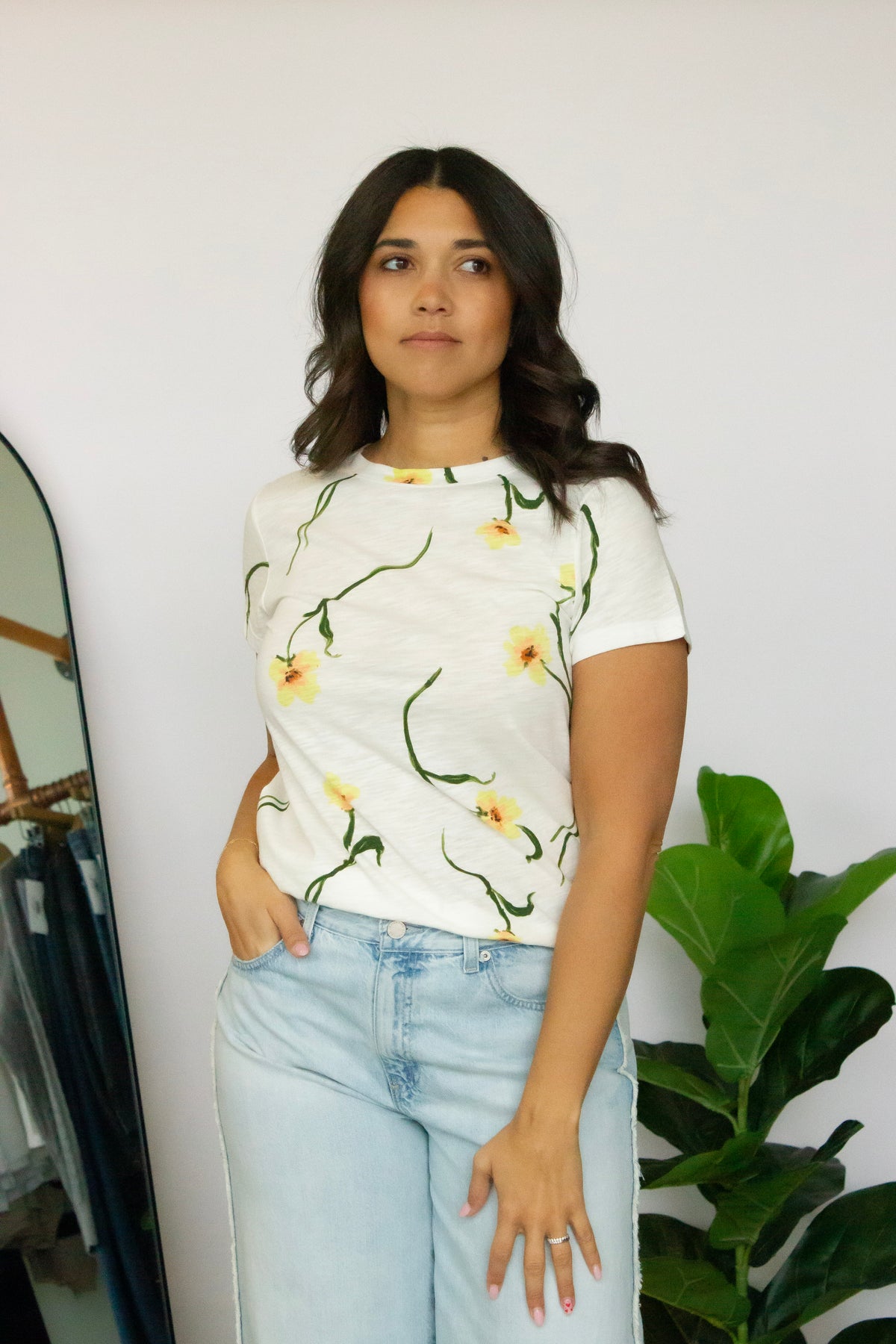 Sanctuary classic crewneck short sleeve tee featuring a modern yellow floral pattern. This versatile wardrobe staple combines comfort with effortless style, perfect for layering or wearing solo. The relaxed fit and breathable fabric make it ideal for everyday wear, while the cheerful floral design adds a touch of botanical charm to any outfit. A go-to piece that transitions seamlessly from casual days to weekend adventures.