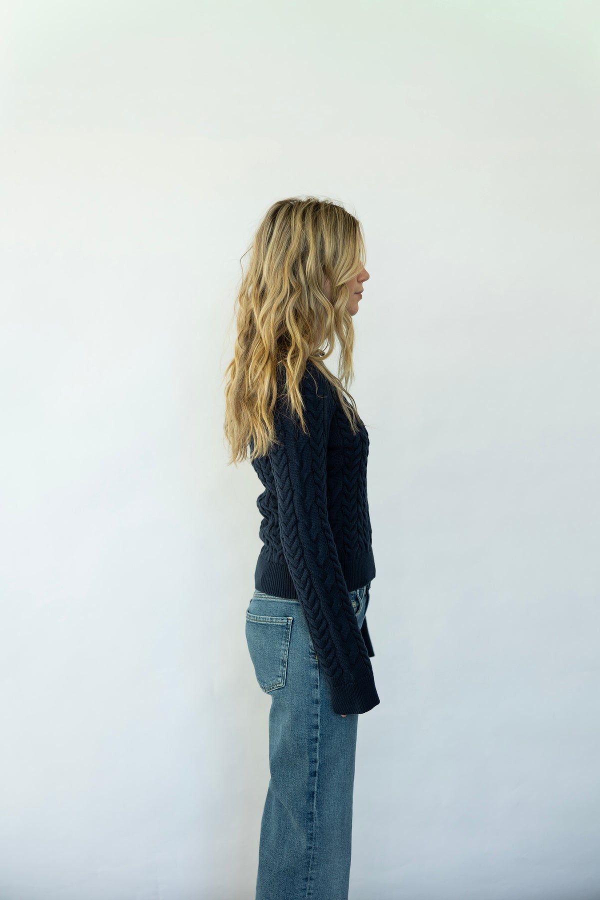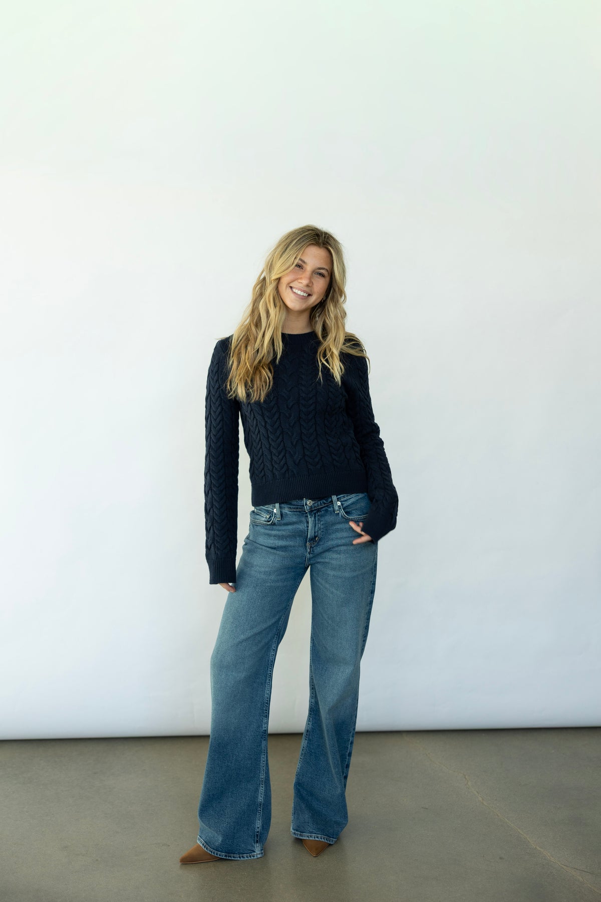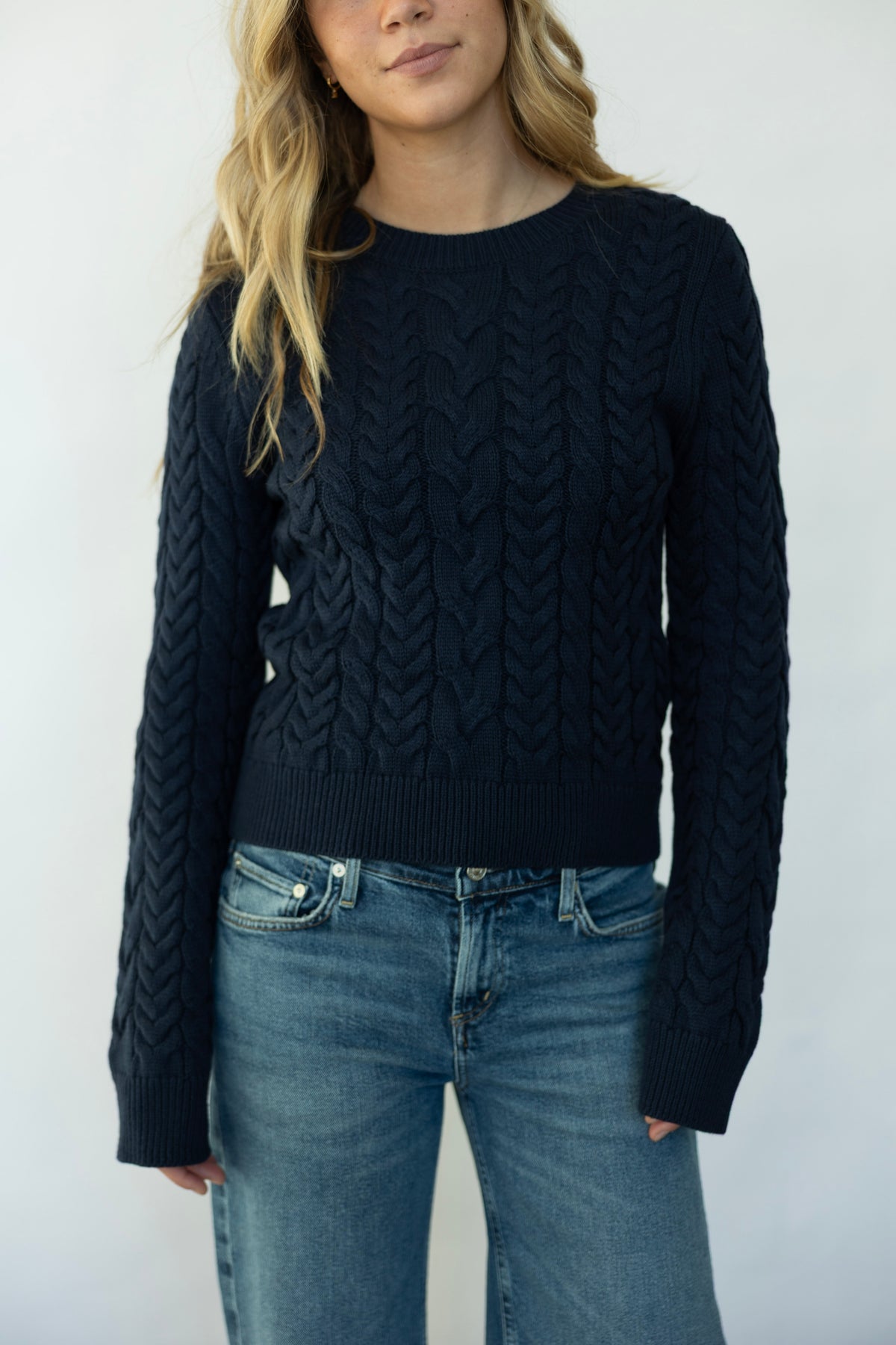 Cozy up in timeless style with the Annabella Cable Sweater from Splendid. This classic navy pullover features a gorgeous cable knit texture that adds visual interest and warmth to any outfit. Perfect for layering over your favorite tee or pairing with jeans for effortless sophistication. Whether you're heading to the office or settling in for a relaxed weekend, this versatile sweater delivers comfort without compromising on charm. A wardrobe essential that never goes out of style.
