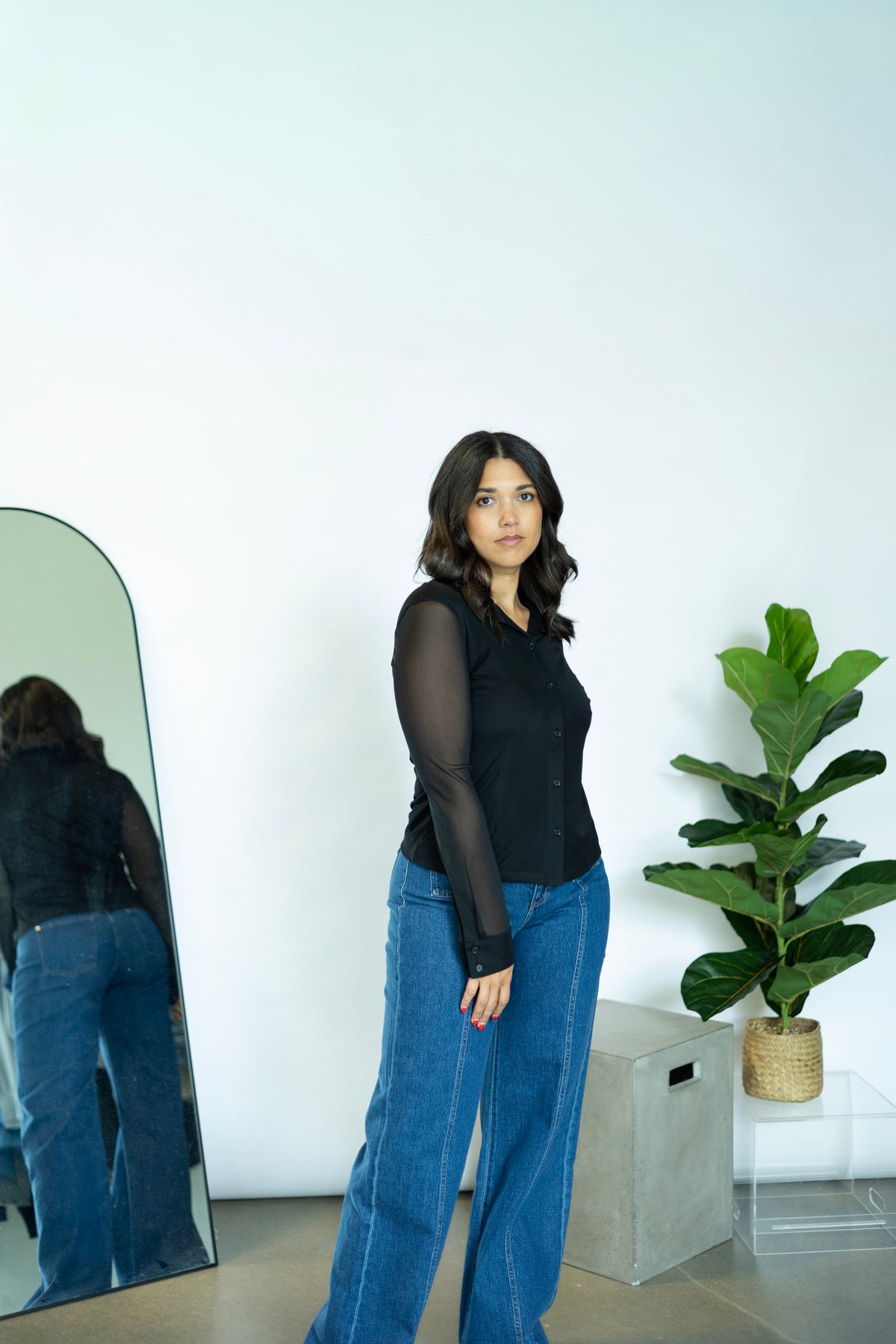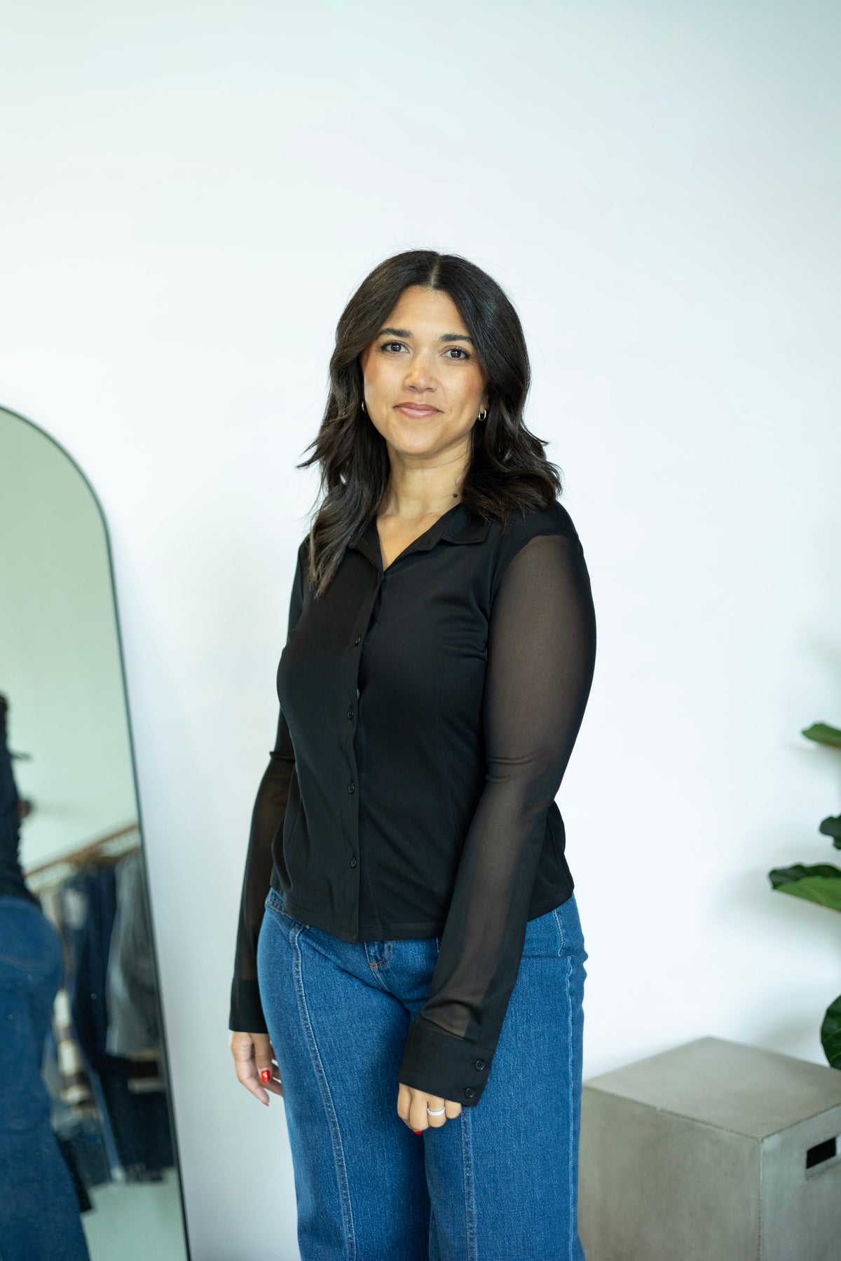 This fitted mesh button-down from Sanctuary features sheer sleeves and a classic collar, combining modern elegance with subtle sophistication. Its lightweight, breathable fabric ensures comfort while maintaining a polished silhouette, making it an ideal choice for layering or standing out on its own. Perfect for professionals seeking a refined yet contemporary look.