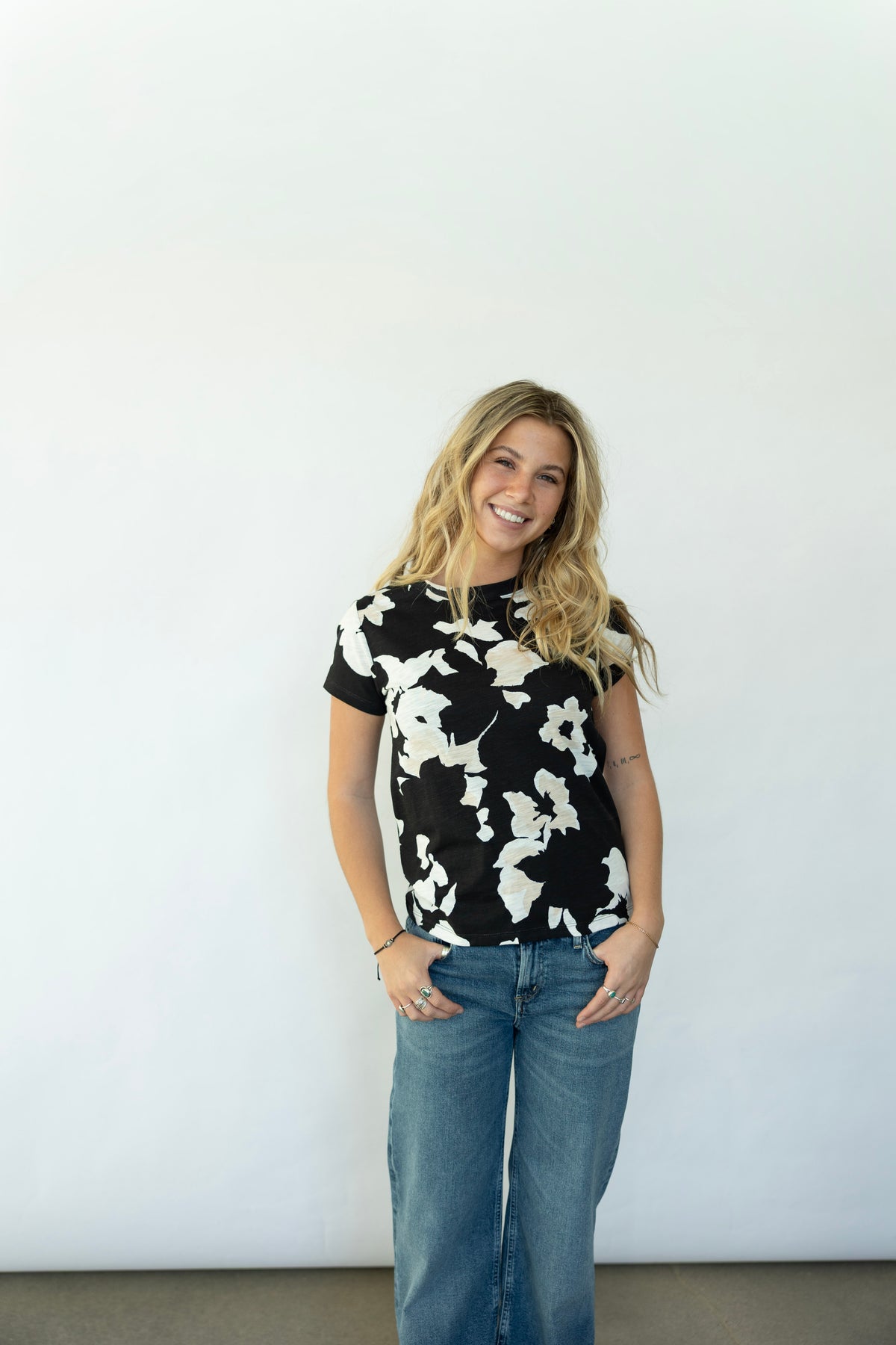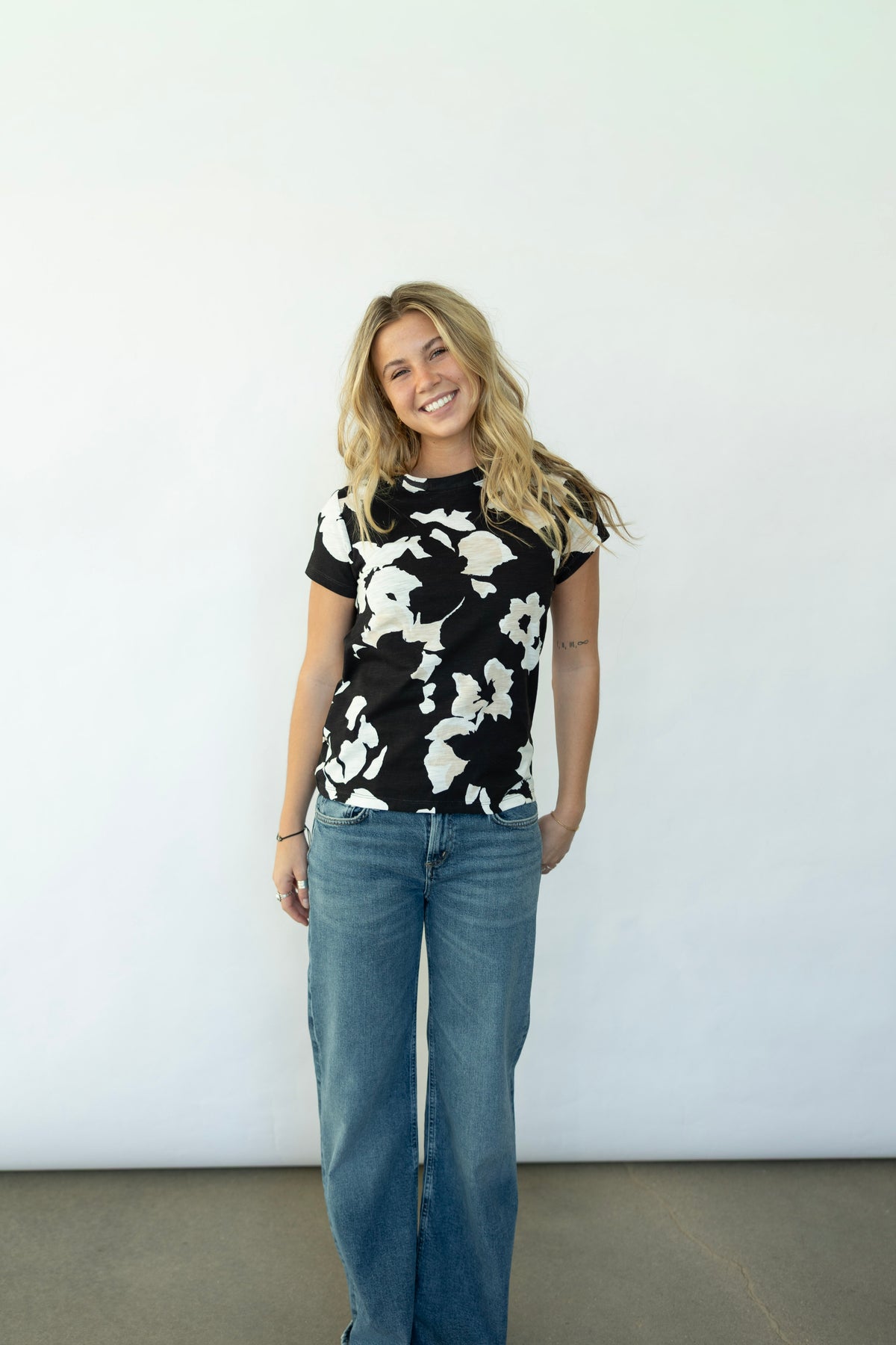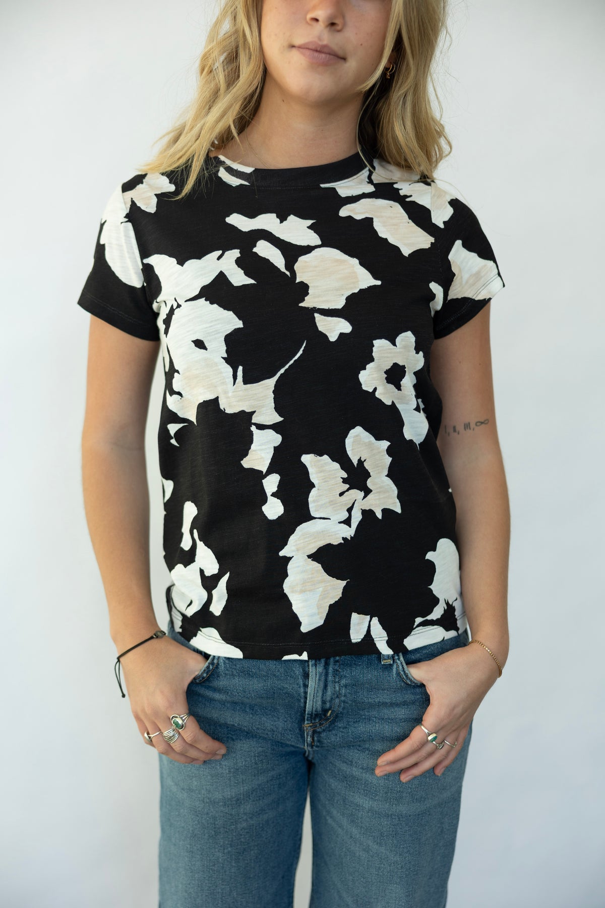 Effortlessly chic and ready for anything, this Sanctuary tee features a subtle floral print that whispers rather than shouts. Crafted in soothing neutral tones, it's the ultimate wardrobe chameleon—pair it with your favorite jeans, layer it under a blazer, or dress it up with a skirt. Simple, versatile, and undeniably wearable, this is the tee that does it all.