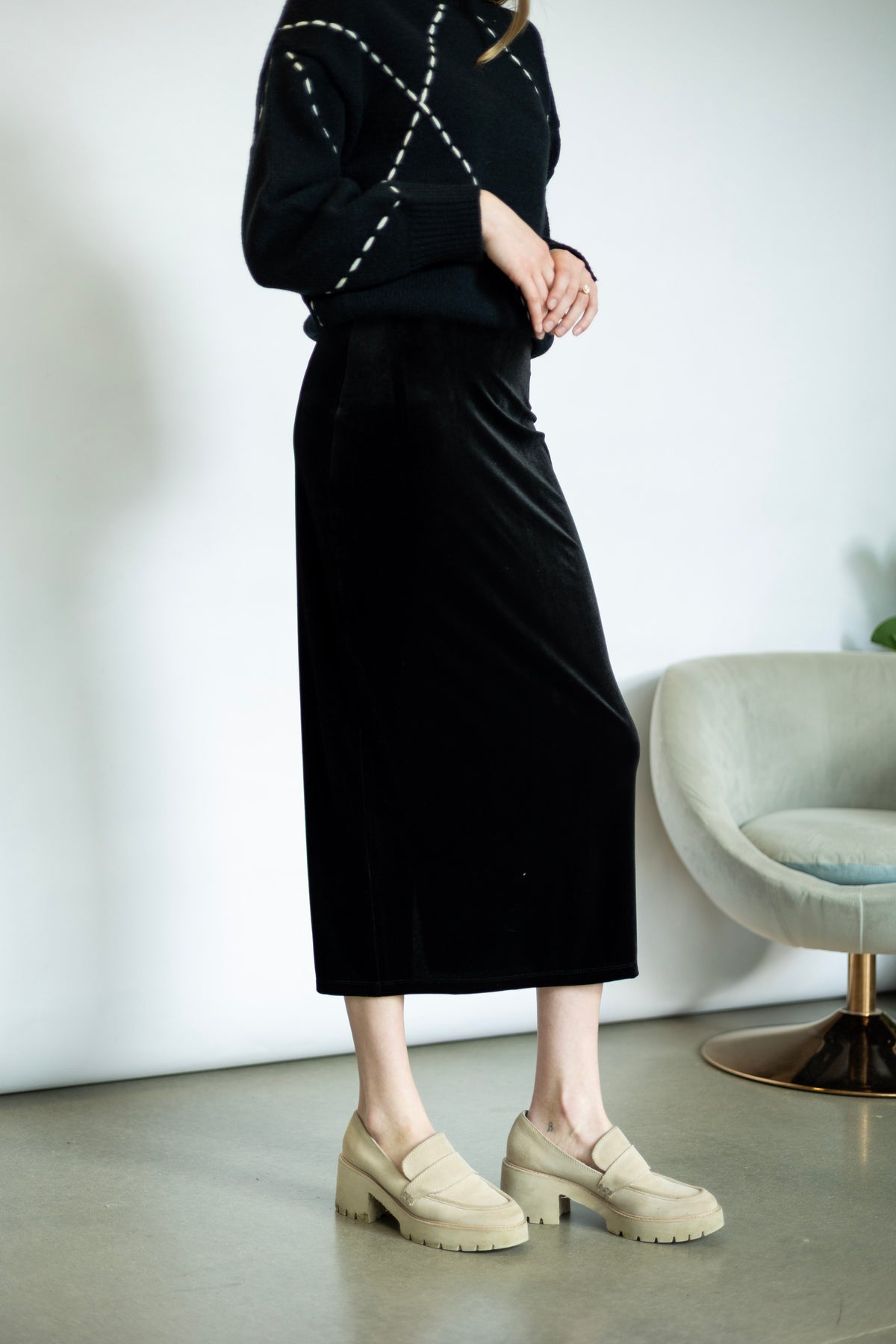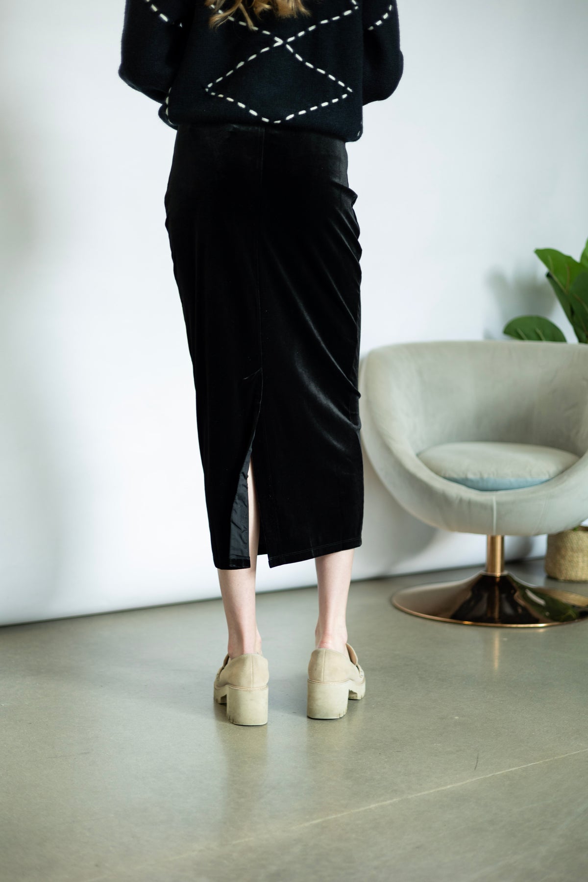 The Dahlia from Gentle Fawn midi skirt in black velvet offers a sophisticated silhouette with luxurious texture. Its mid-length design balances elegance and versatility, making it suitable for both formal occasions and refined everyday wear.