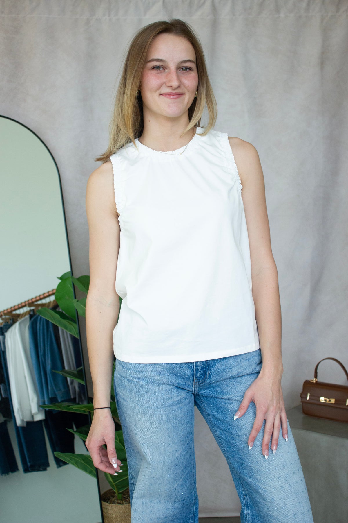 Effortless style meets fun details in this cotton jersey top. The relaxed round neckline and sleeveless cut make it perfect for layering or wearing solo, while charming ruffles frame the neck and armholes for a playful touch. Soft, breathable fabric keeps you comfortable all day long. A versatile piece that works with everything in your closet.