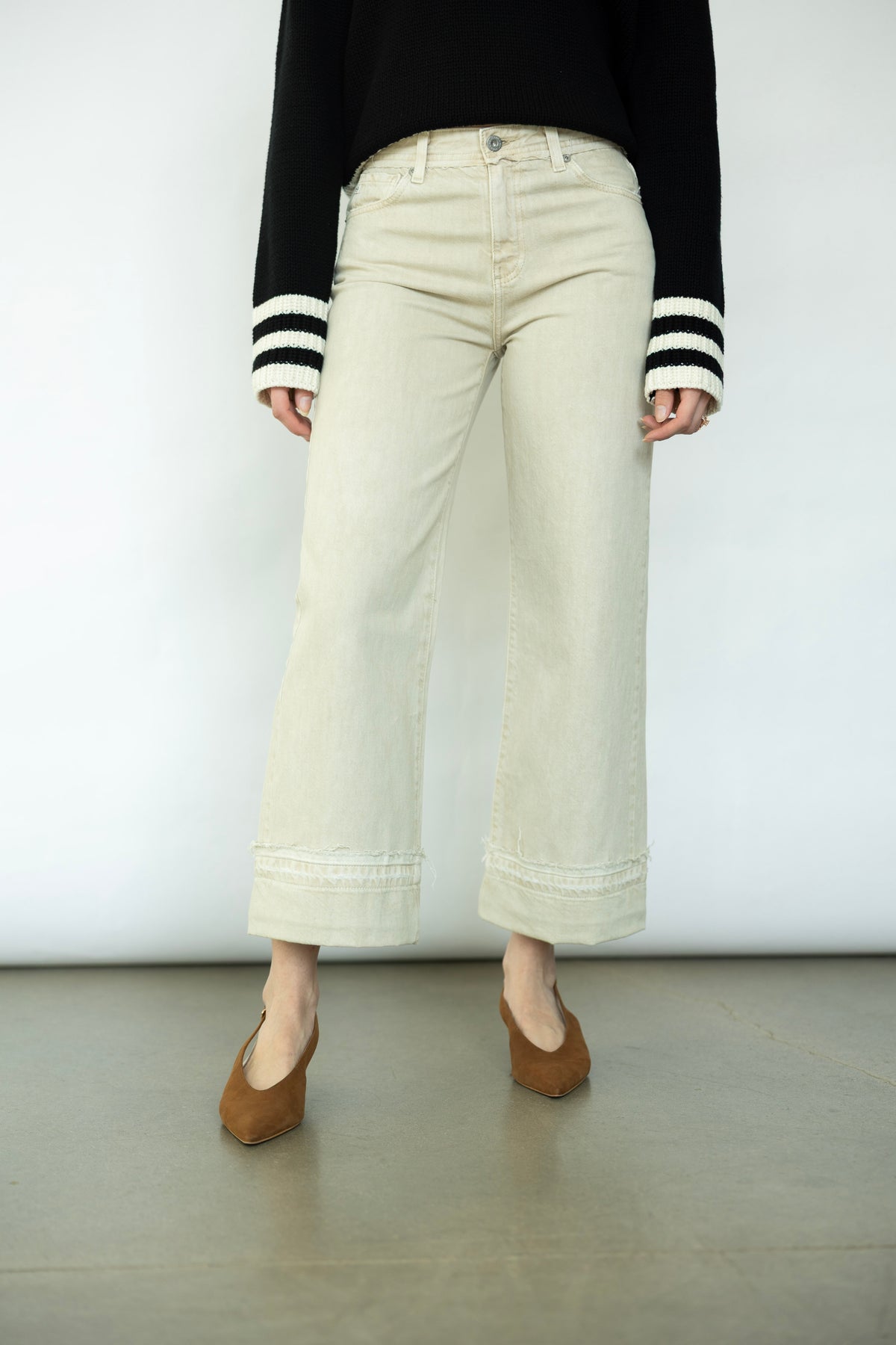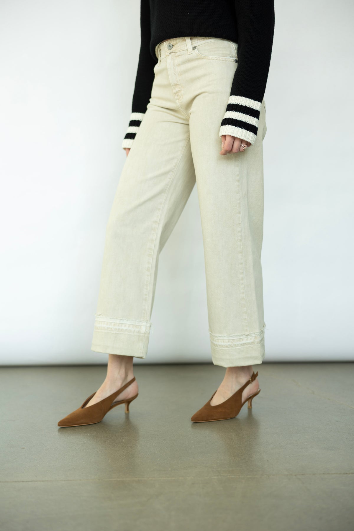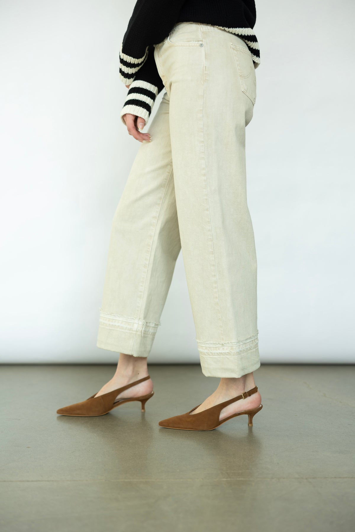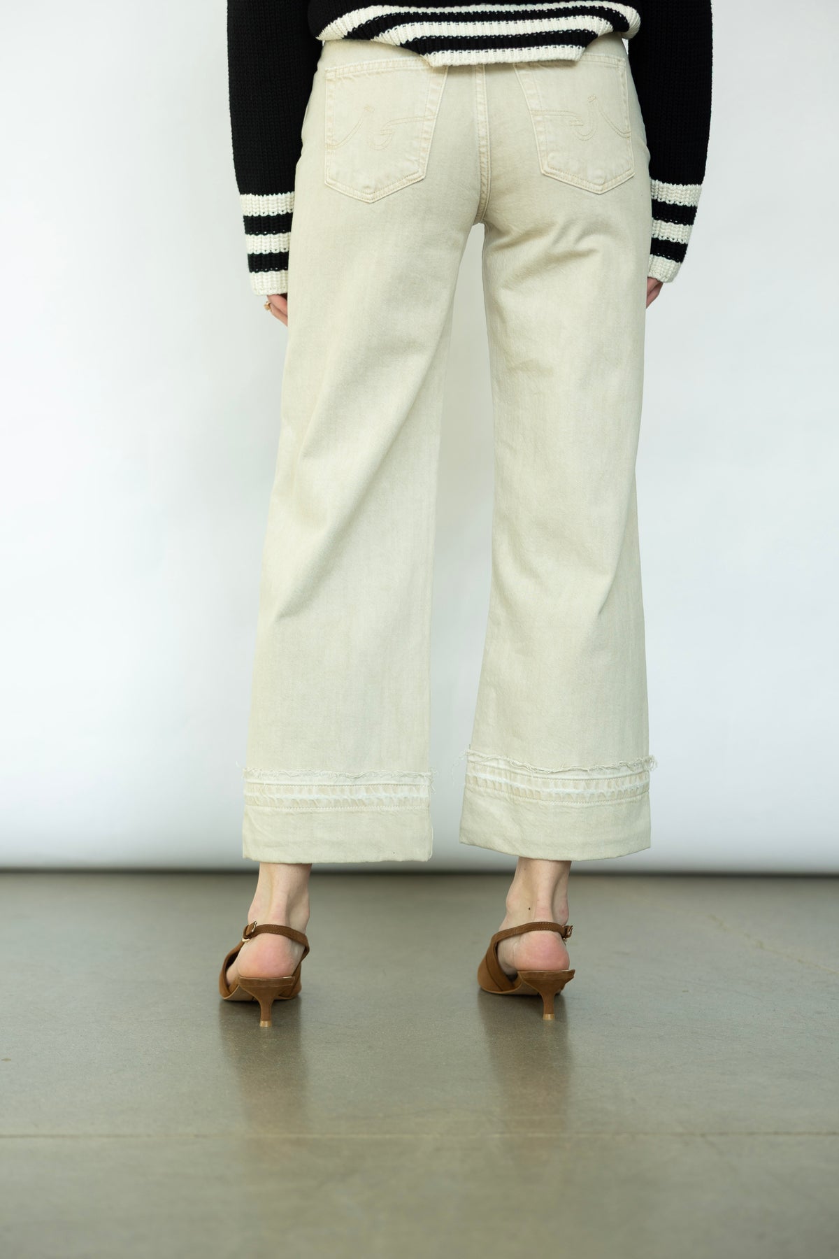 Meet your new go-to pair. The Saige Wide Leg Crop from AG features a stunning cream tone that effortlessly complements any outfit. The distressed detailing gives it that perfectly imperfect edge. Whether you're styling it with a crisp white button-up and loafers or throwing on a cozy sweater and sneakers, this crop transitions seamlessly from day to night.